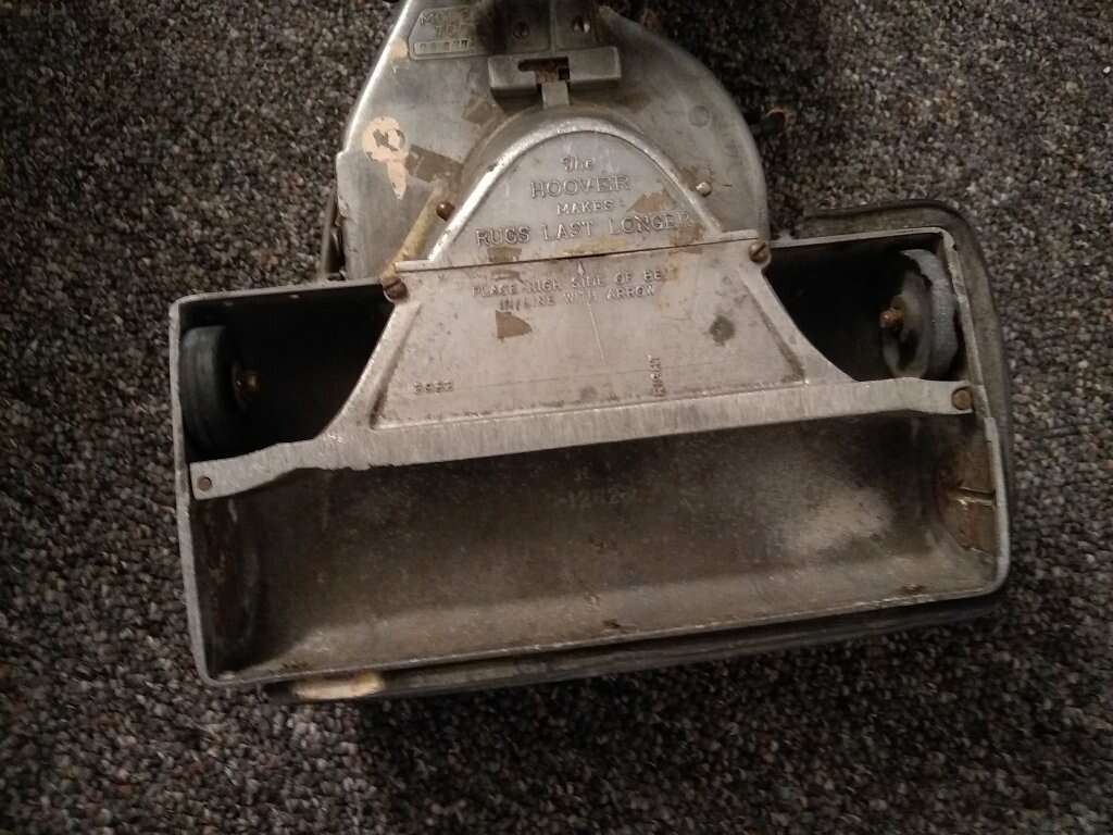 Hoover 700 vacuum cleaner. Still working but missing the bar with bristles to pick up dirt. Also miss a part to keep upright handle it up position. Selling on ebay for as much as $300. Needs some restoration. Included bag. Sold as is. Made 1926-1928. First aluminum vacuum with roller brush and on and off switch. Made in February 1927.