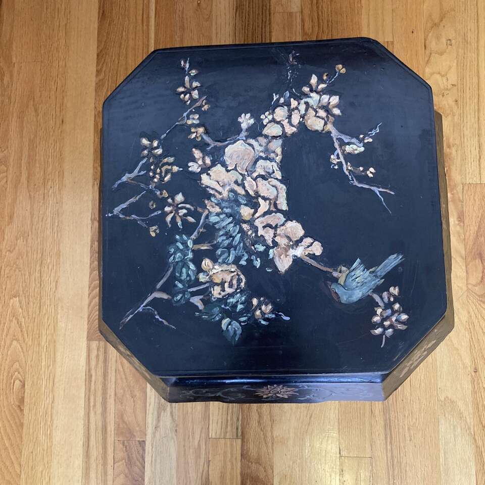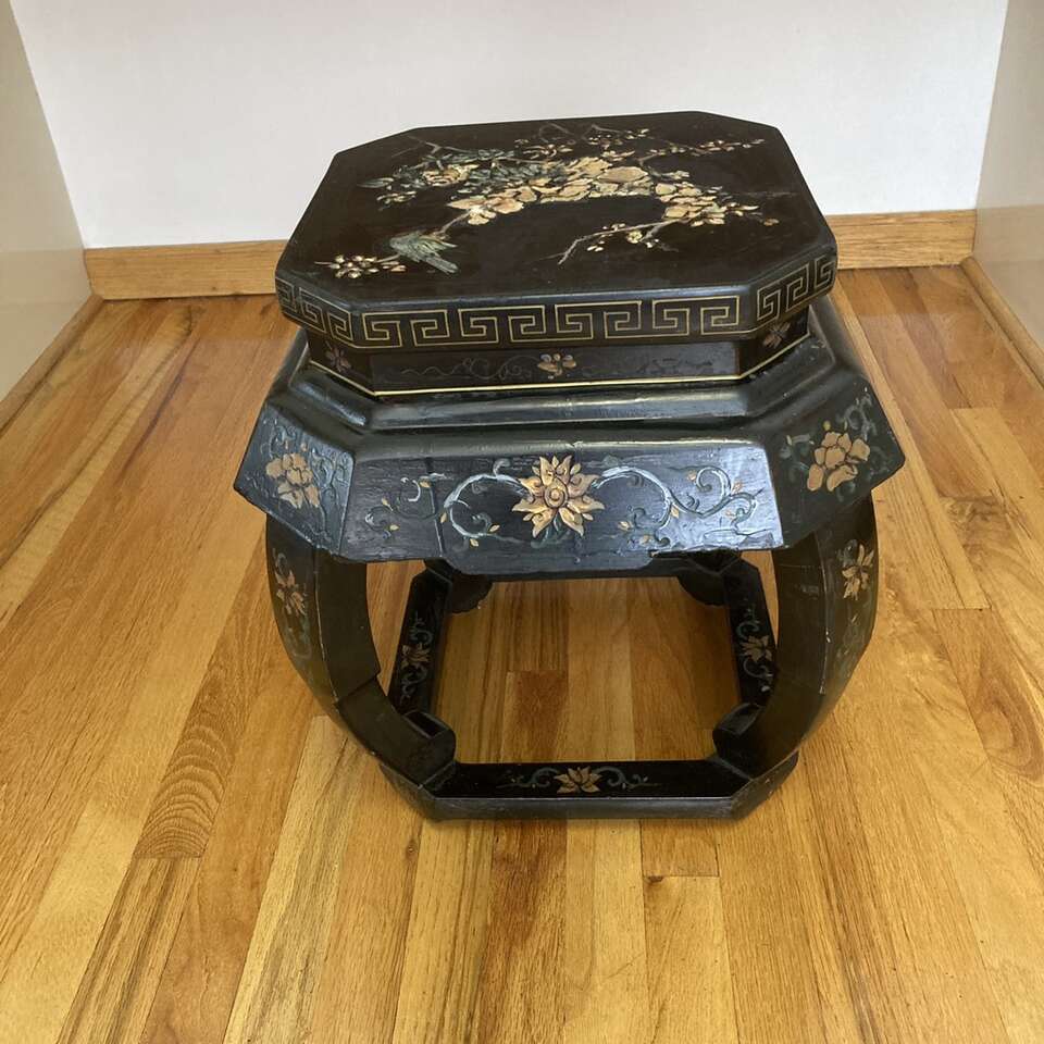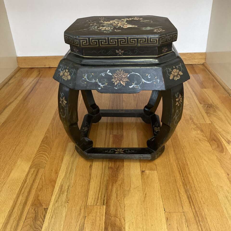 Vintage Chinese Wood Barrel Stool Side Table Plant Stand 18” high. Black lacquer with carved wood, floral pattern in golds, greens, blues, and beige colors.
