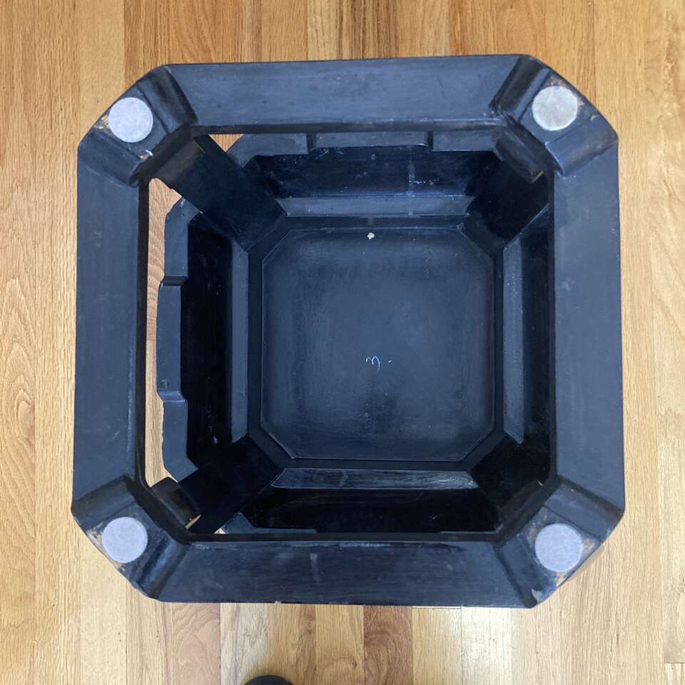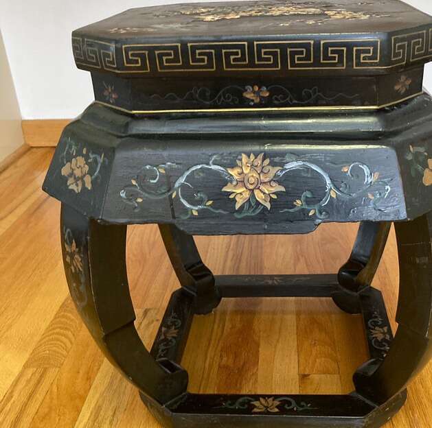This is 18” high, 13” diameter top, just over 17” diameter in the middle. Weight is approximately 9.5 lbs. The black enamel surfaces have chips and cracks to them as well as some of the woodwork on its edges - top floral pattern has been repaired and shows signs of surface distortions. Pictures are of the actual item for sale in part of the description. Giving a new home and life to pre-owned sustainable items, I carefully describe and photograph the condition. Acquired at an estate sale. As always, reach out with any questions.