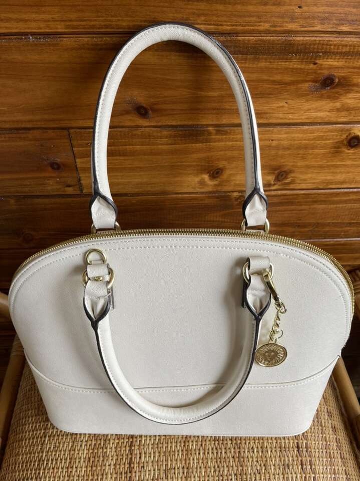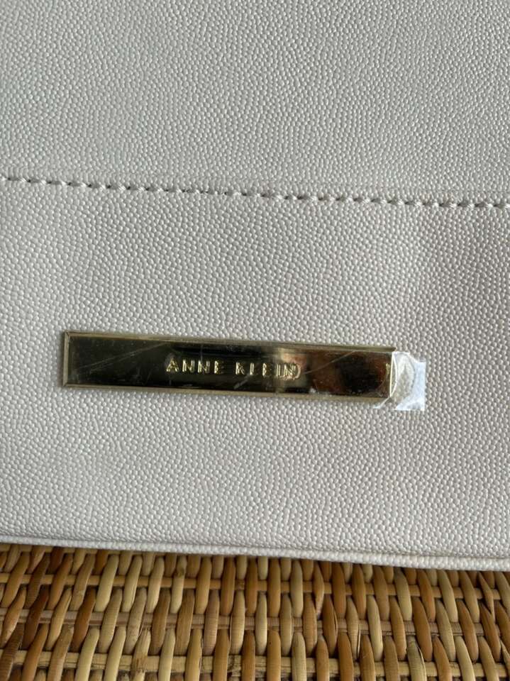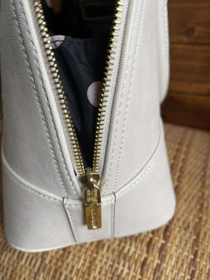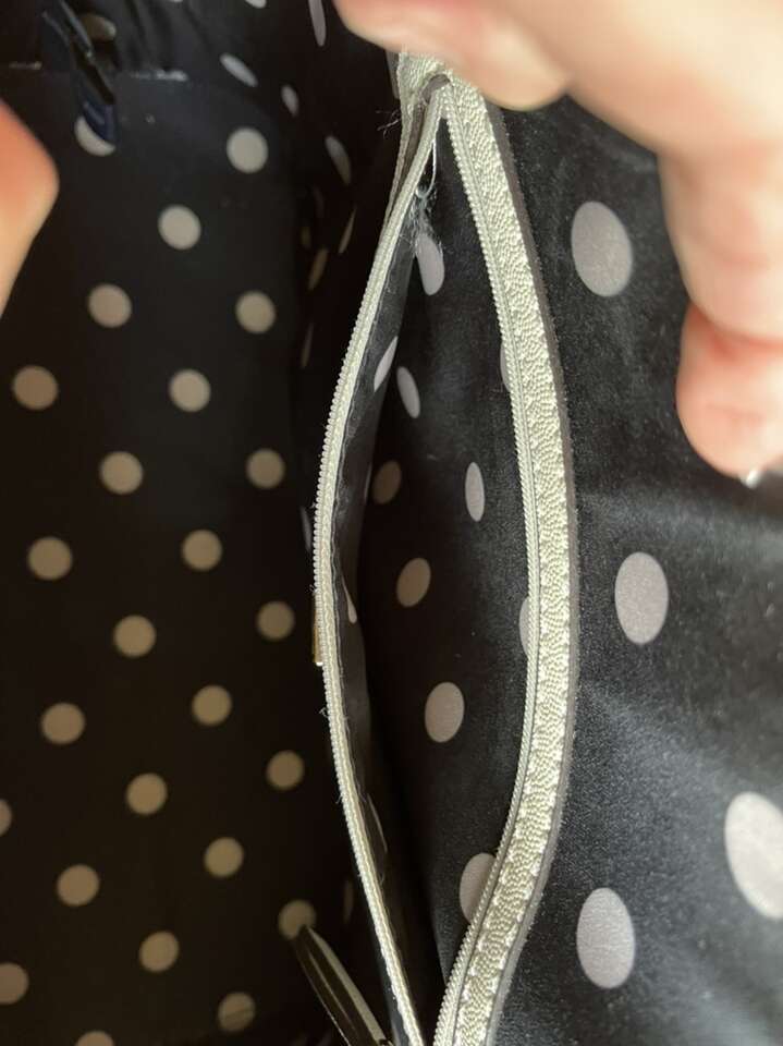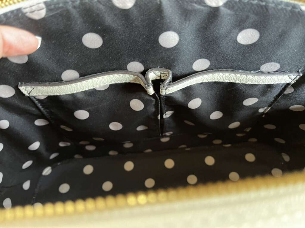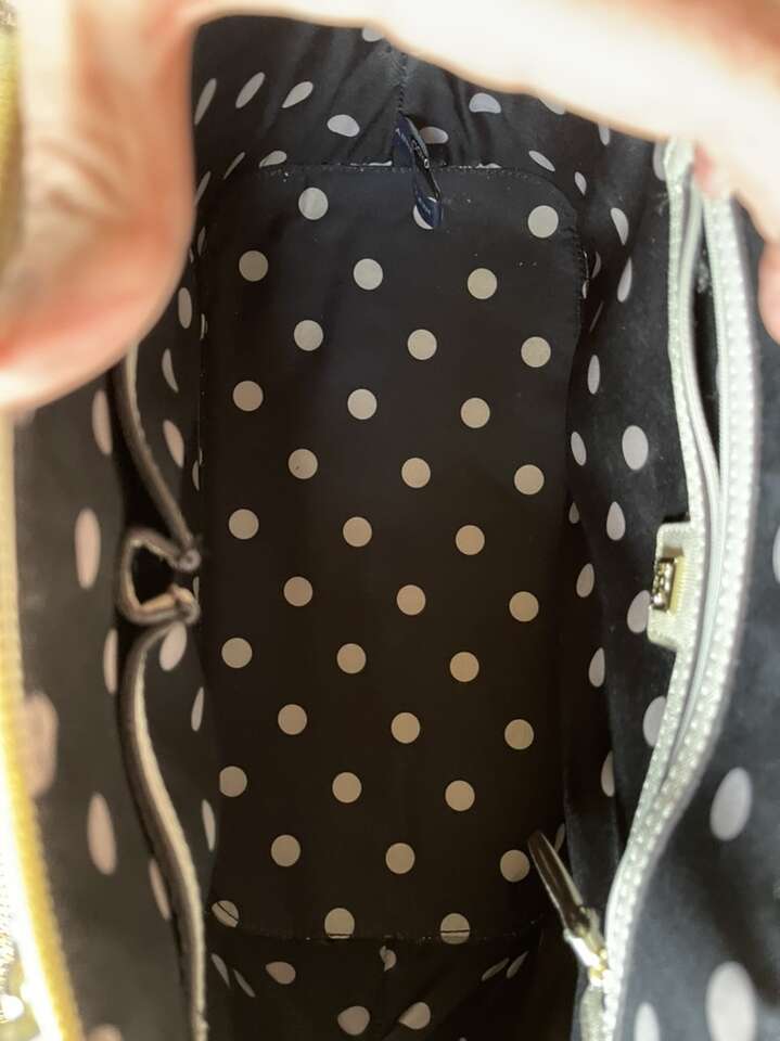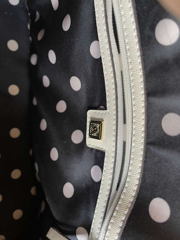 Like new! Used only once, still has plastic cover over metal name tag. Black interior with cream colored polka dots. One interior zipper compartment and two additional open compartments. Approximately 15 length 10 height. Notice small black dot on bottom.