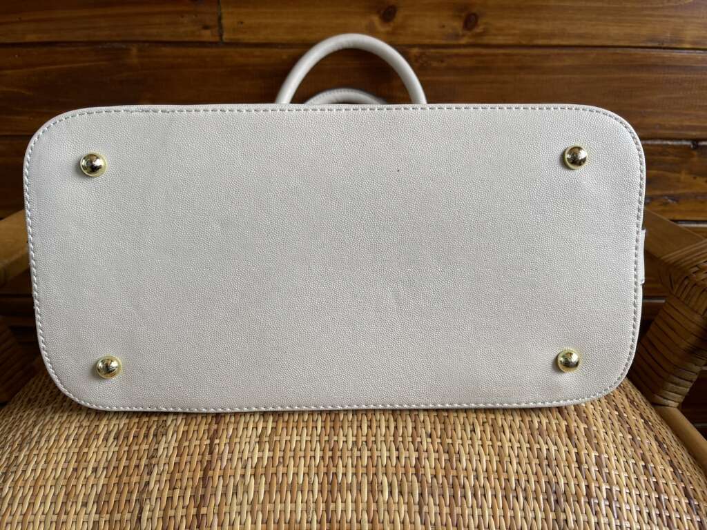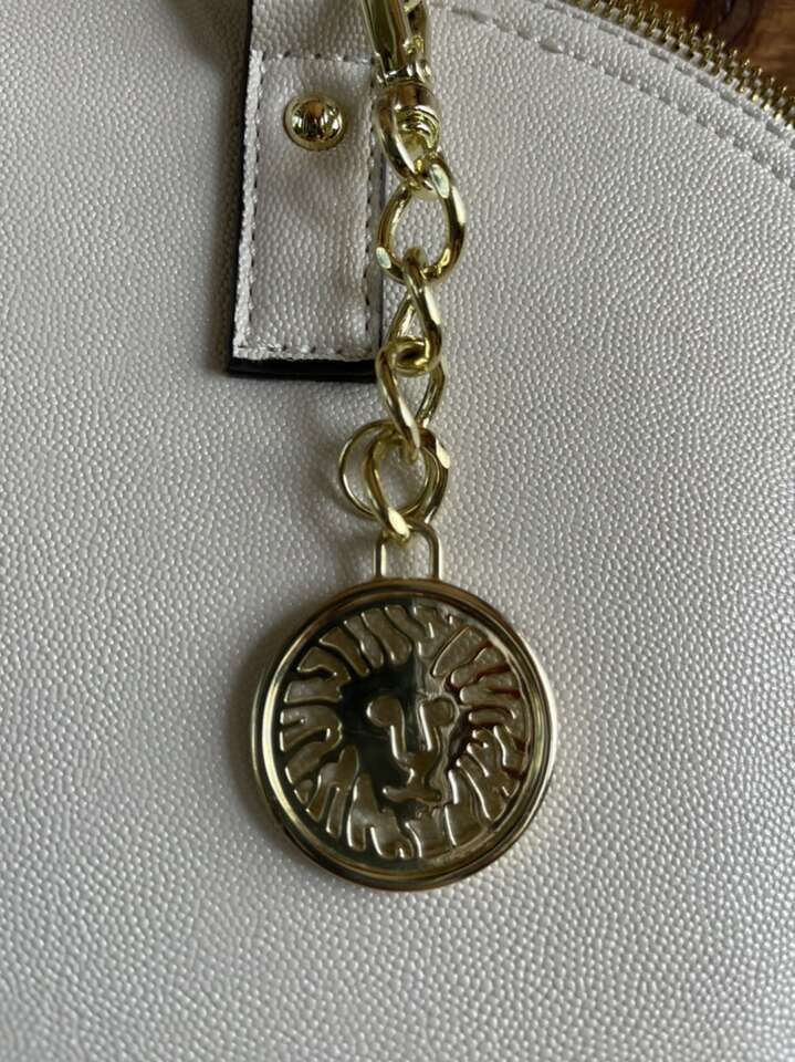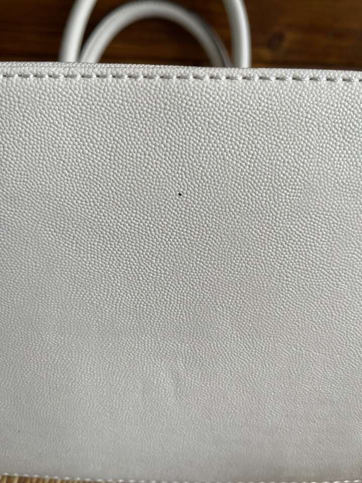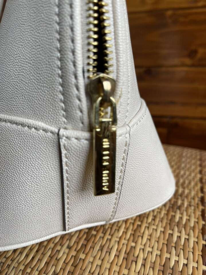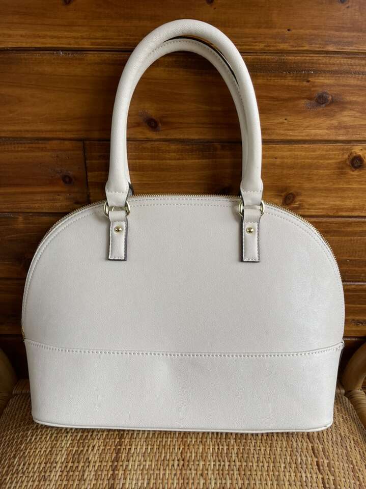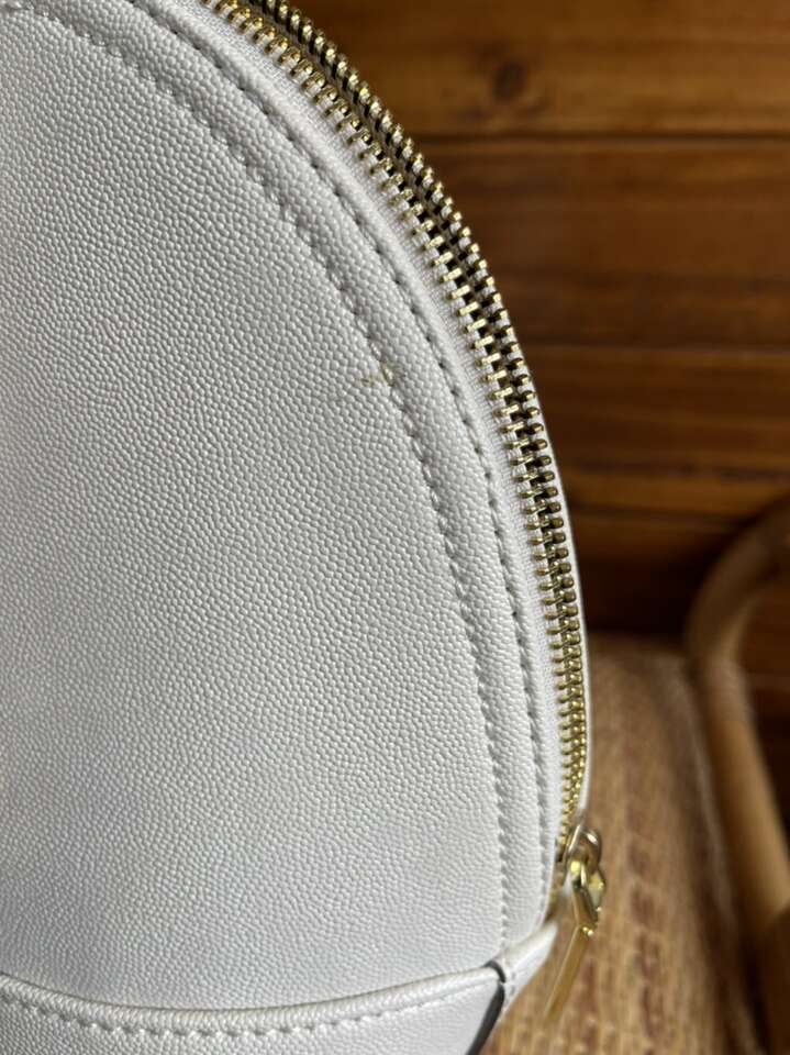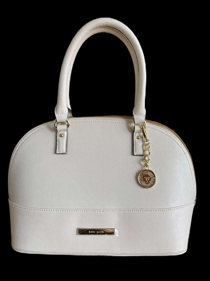 Like new! Used only once, still has plastic cover over metal name tag. Black interior with cream colored polka dots. One interior zipper compartment and two additional open compartments. Approximately 15 length 10 height. Notice small black dot on bottom.