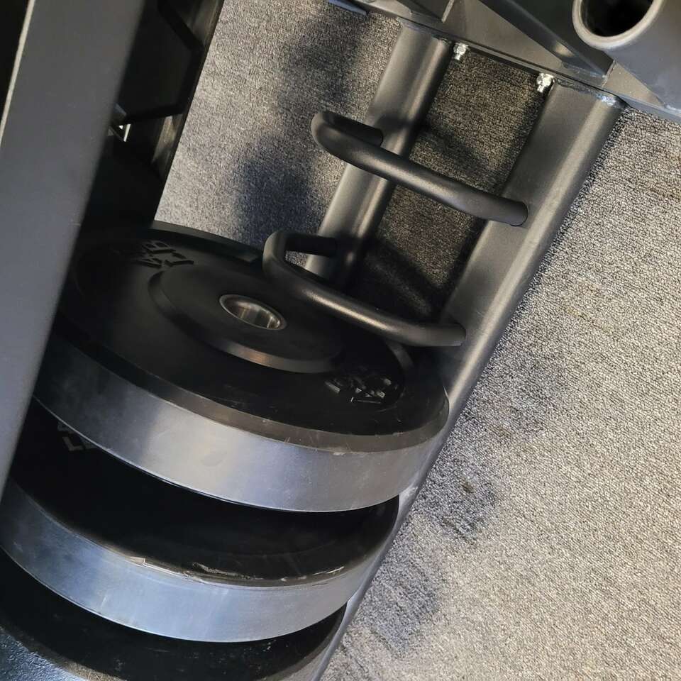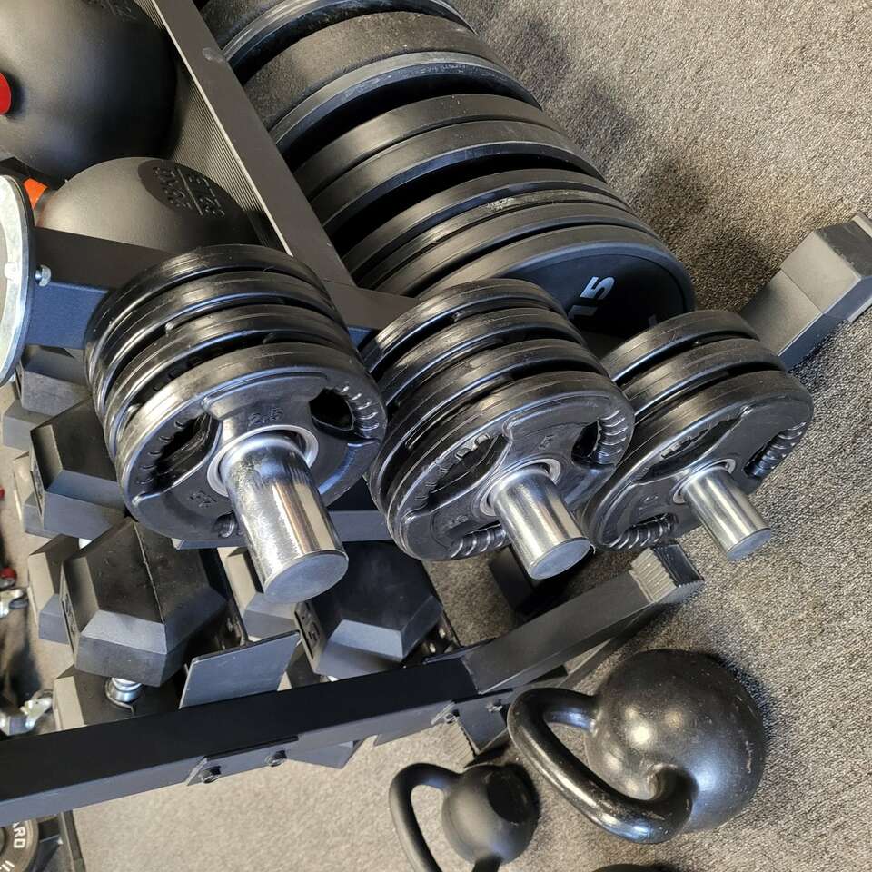 New style of combination bumper plate, kettlebell and barbell storage rack. This will hold 500+ pounds of Bumper Plates, 5-10 kettlebells (depending on the size of the Kettlebells), plus storage for two barbells and change plates on the other side.