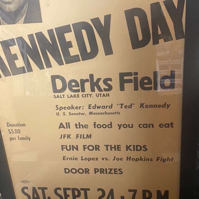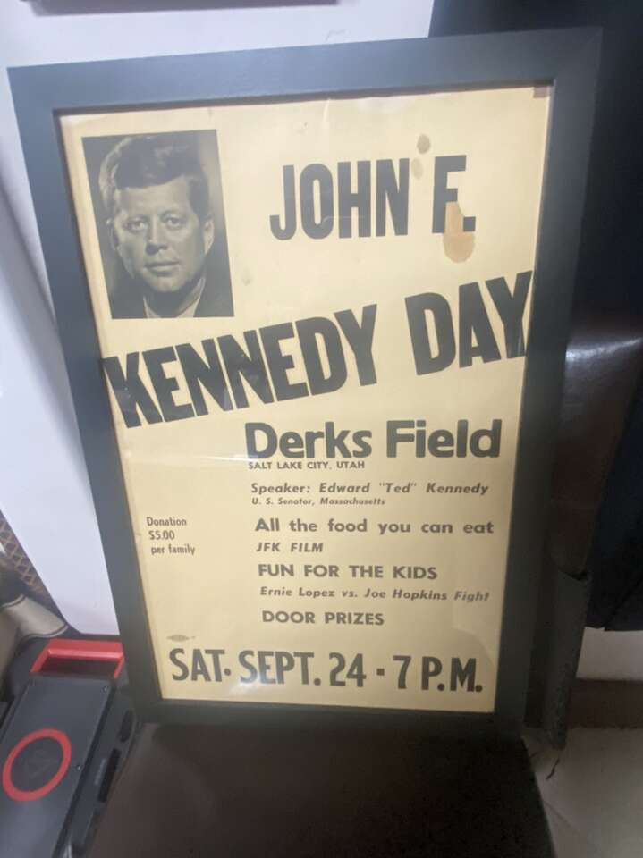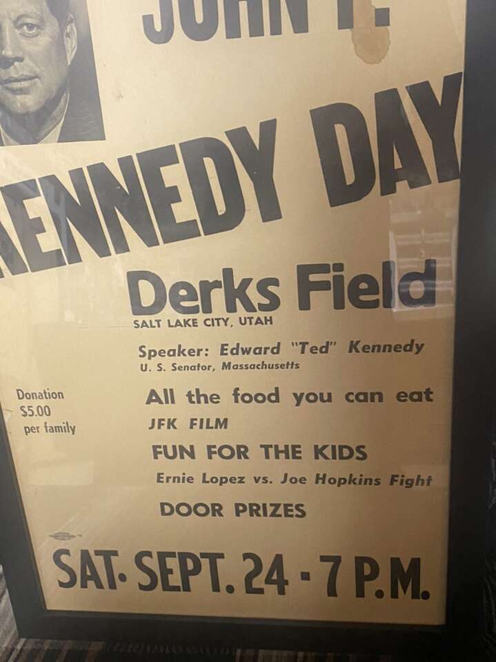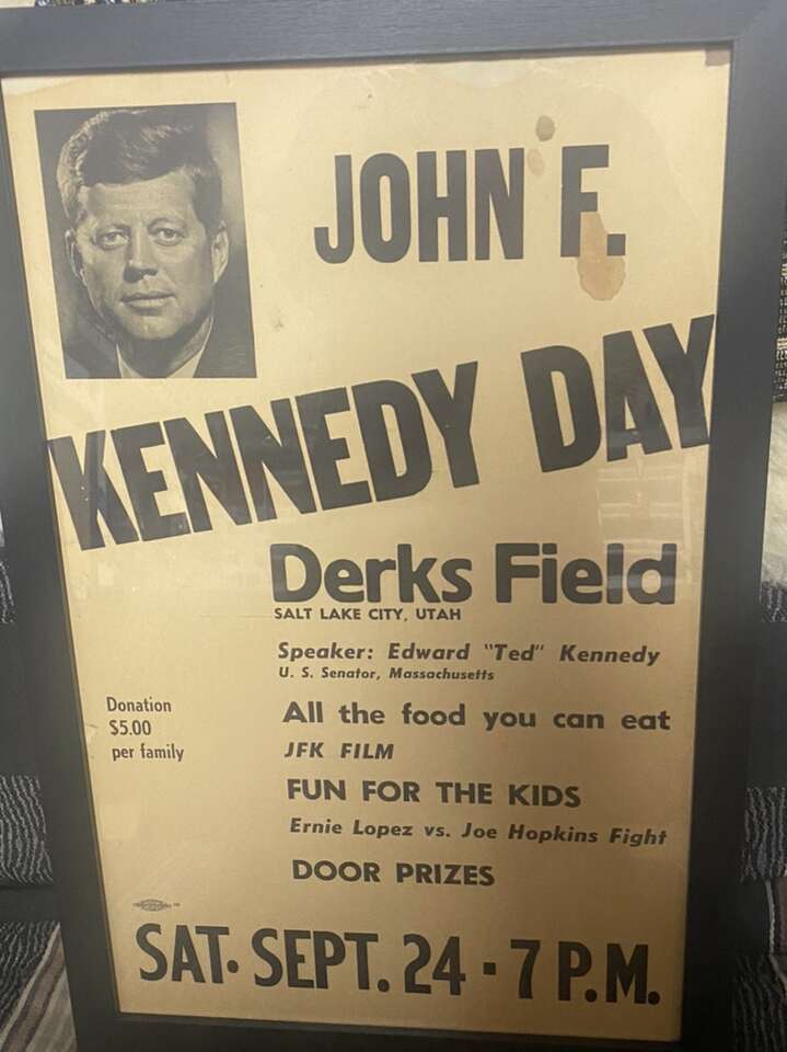 Late 1950s “John F Kennedy” Campaign Poster With “Edward Ted Kennedy” As Speaker At “Derks Field Base Ball Field”In The Late 1950s. Poster Is 14” By 22” In A Black Wood Grained Picture Frame With A Certified Union Stamp In Salt Lake City By Allied Printing. Poster Is Made Of Heavy Cardboard. Poster Has Lots Of History Here In Utah With Derks Field Being Posted On It Along With Two Professional Fighters “Boxers” Ernie Lopez Vs Joe Hopkins Who Where Originally From Here In Utah, Our 35th US President John F Kennedy And His Brother Senator Edward “Ted”Kennedy. Very Rare Vintage Poster Sign. Utah History. $125