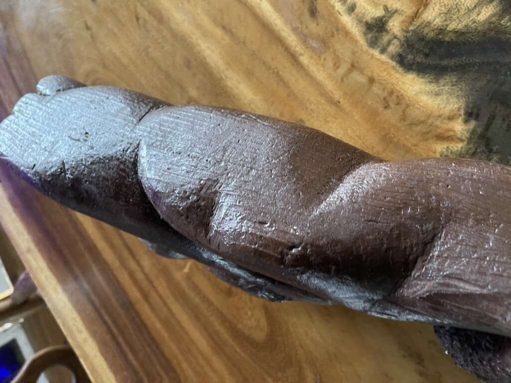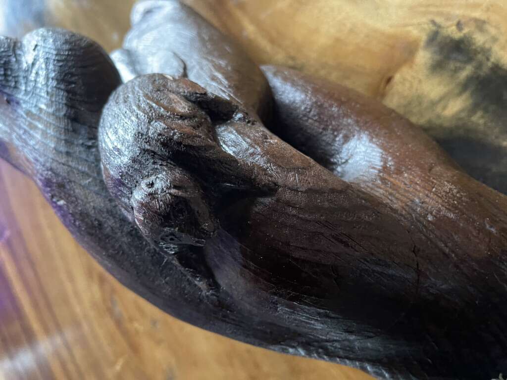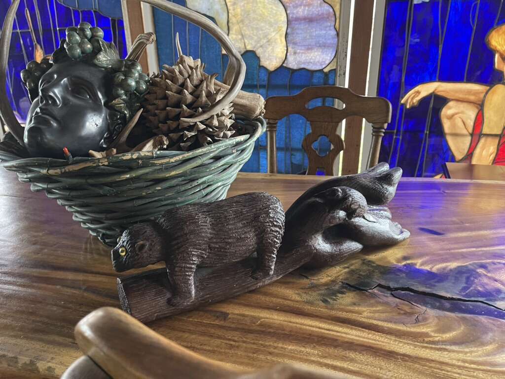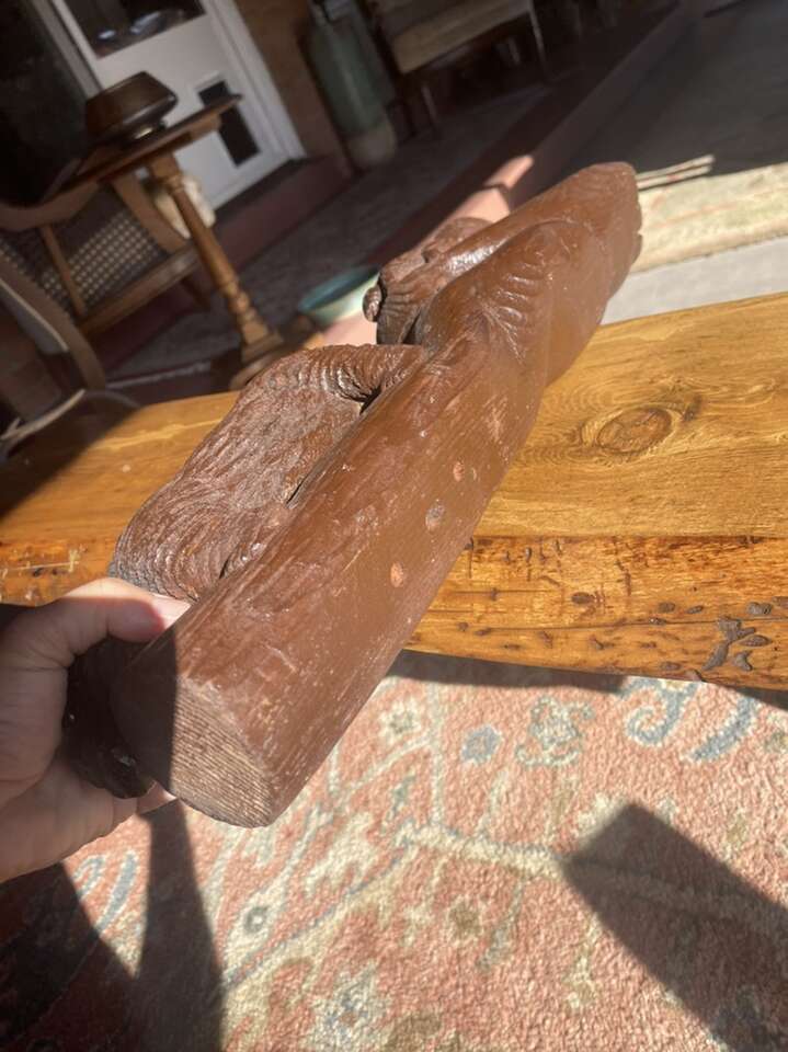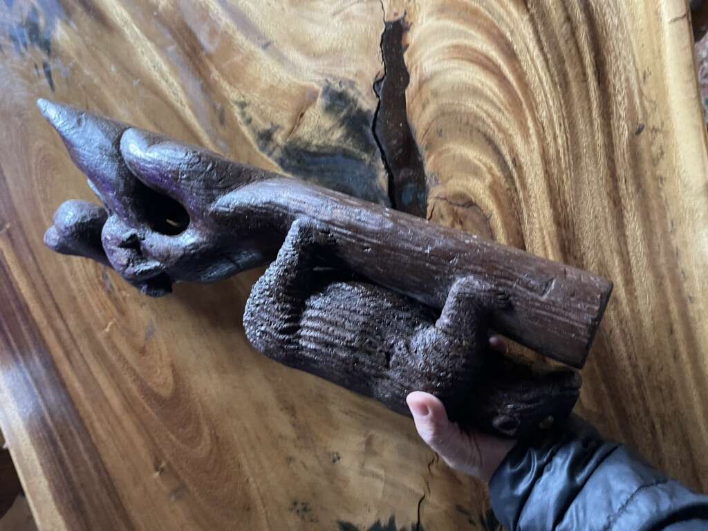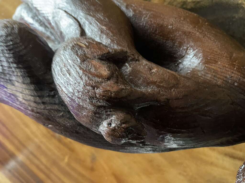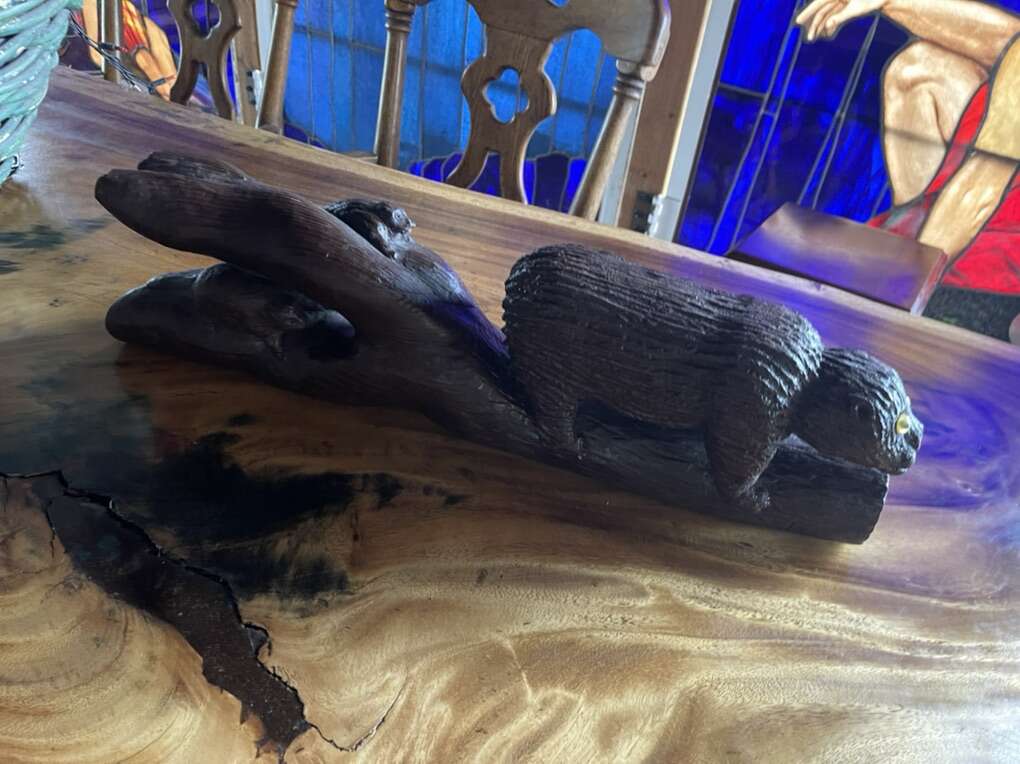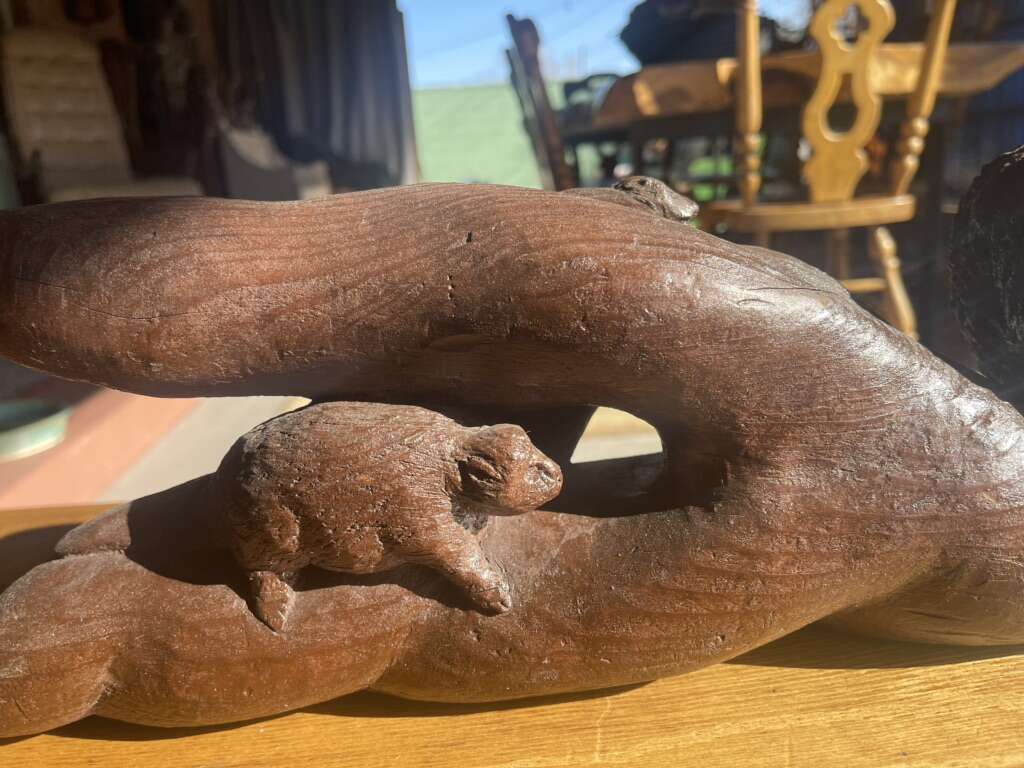 Aprox 18” long , hand carved , this has been laying around the house forever , it’s super cool very old hand carved one of a kind beaver and 2 beaver pups on a log