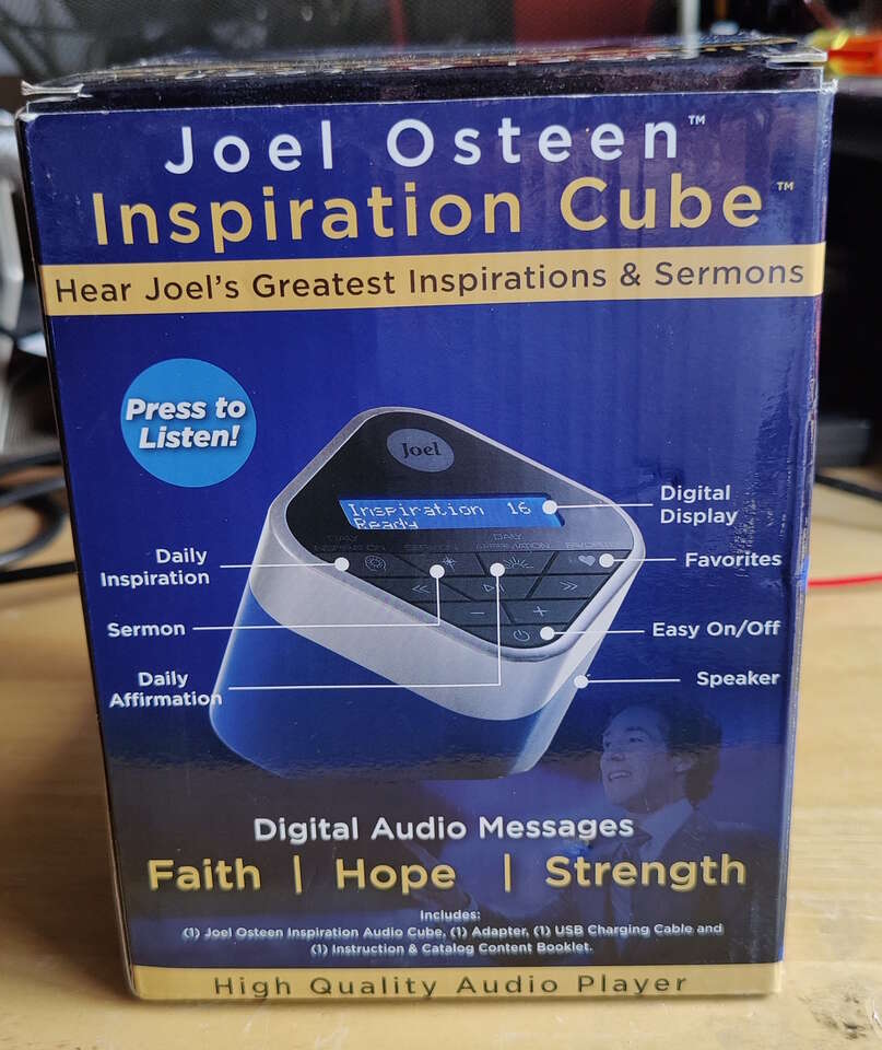 VenmoJoel Osteen Inspiration Audio Cube With 52 Sermons 365 Inspirations and More. Brand new in original box with all instructions and accessories. I opened it, charged it and verified it is in working condition. Impressed with the quality of the sound from the speaker, very strong and clear. Instruction sheets are in the bottom, charging cable and charger are in the box. Call if you have any questions. I can ship it anywhere for $20.
