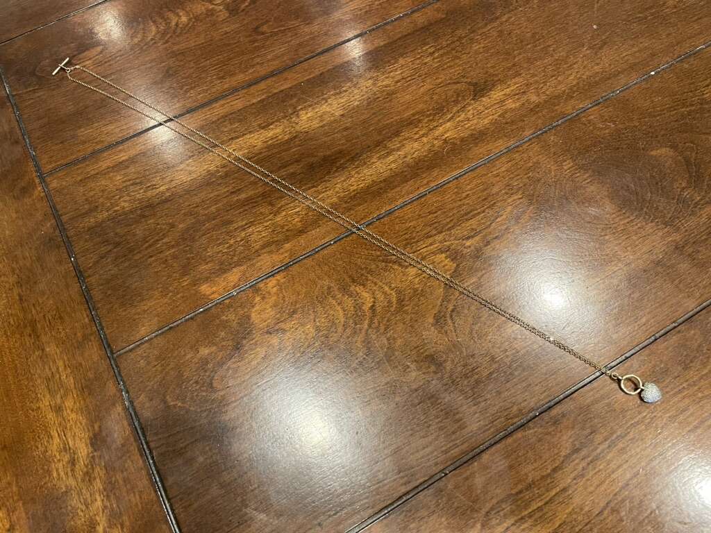 I have a really long gold tone chain with a gold ring holding a sparkly silver heart. The necklace is almost 36 inches long. It doesn’t have a clasp and just goes over your head to put it in. The charm is 1 inch long with the ring and heart together. See my other ads for jewelry, artwork, home decor and more.