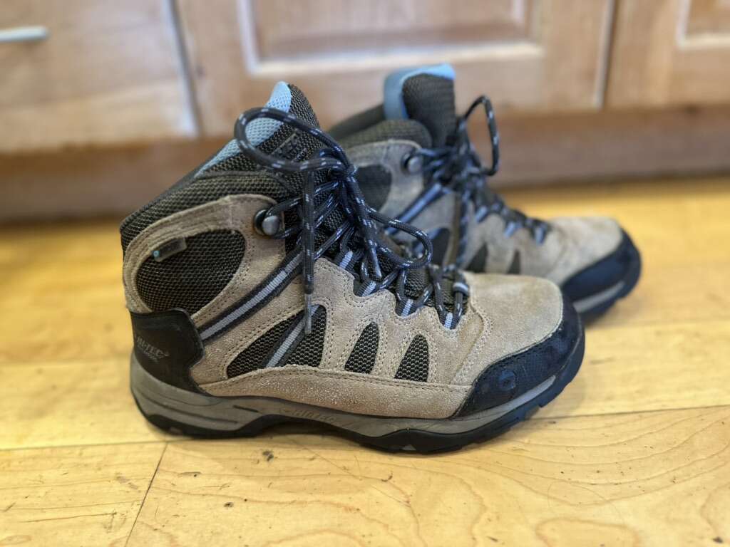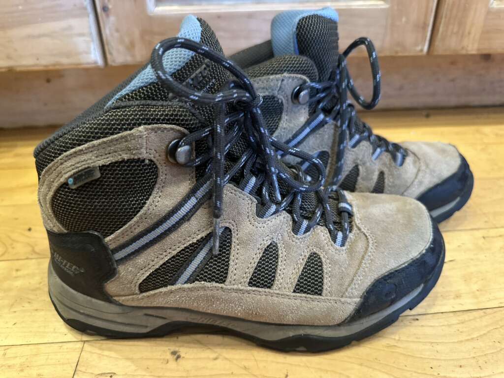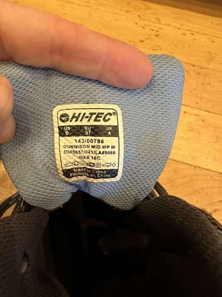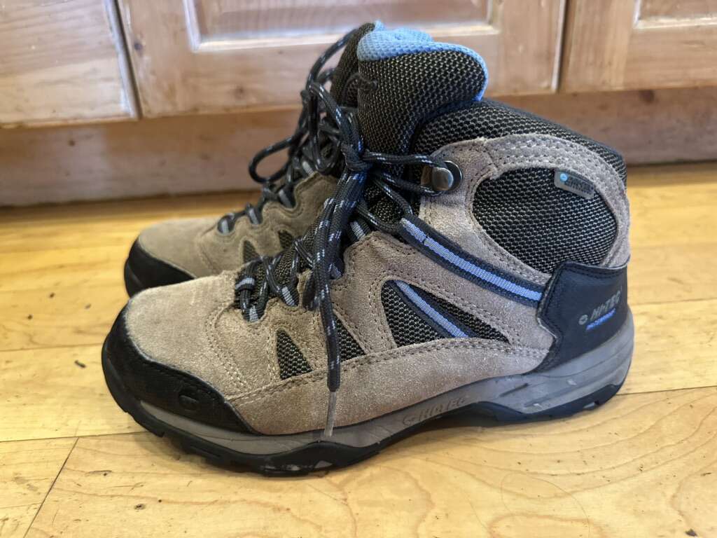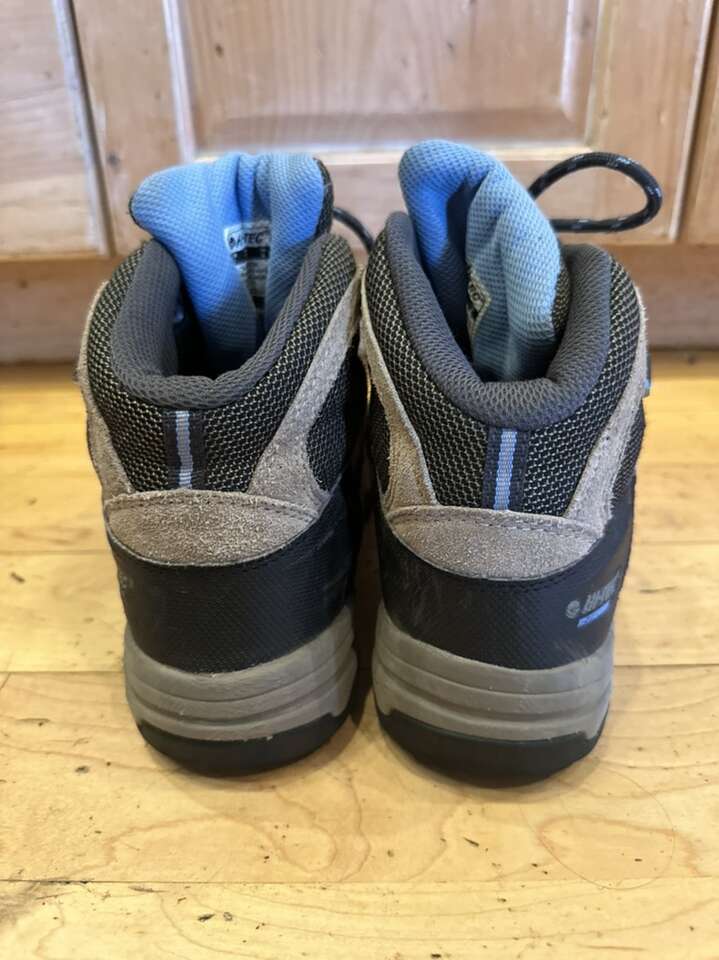 Hi-tec youth size 4.5 beige/black with blue trim, waterproof mid hiking boots. These are in excellent condition. See photos for details. I take cash or Venmo. Text is best. 801-201-4446.