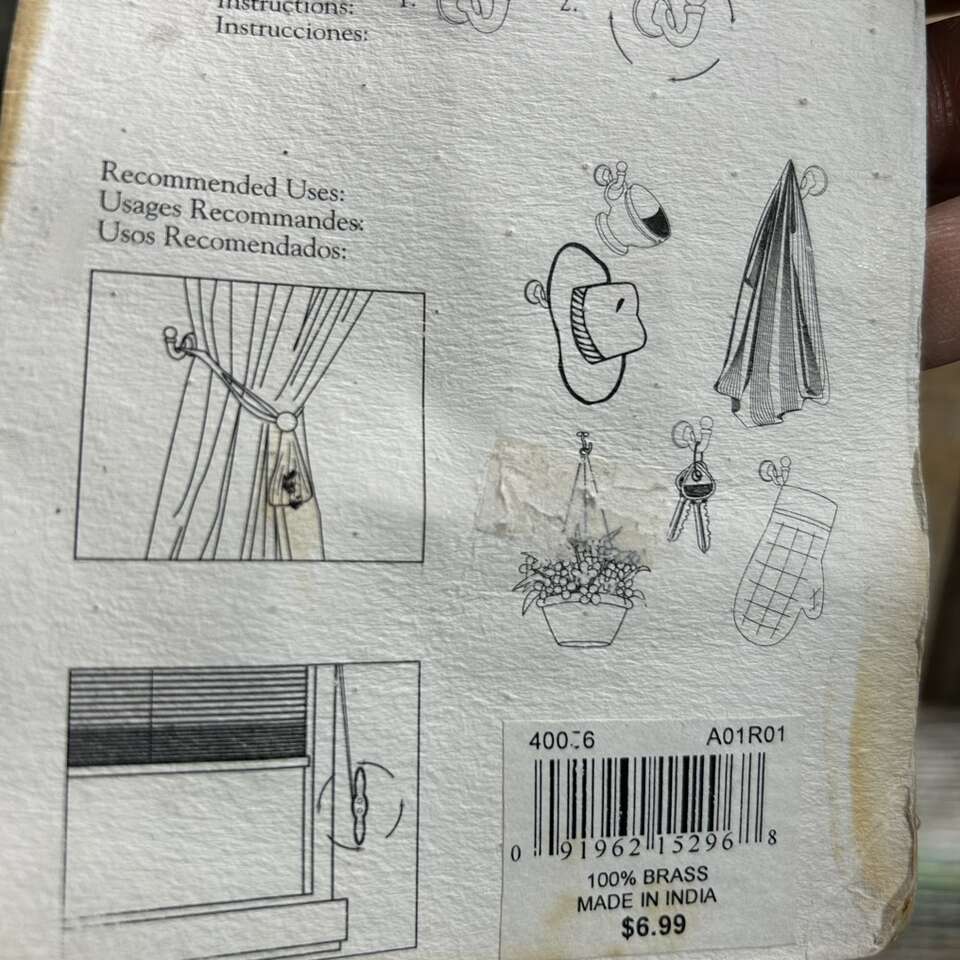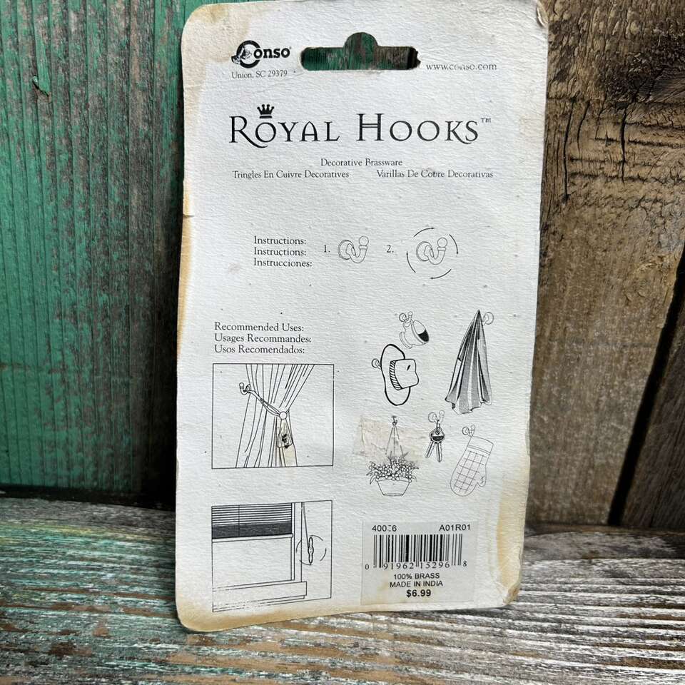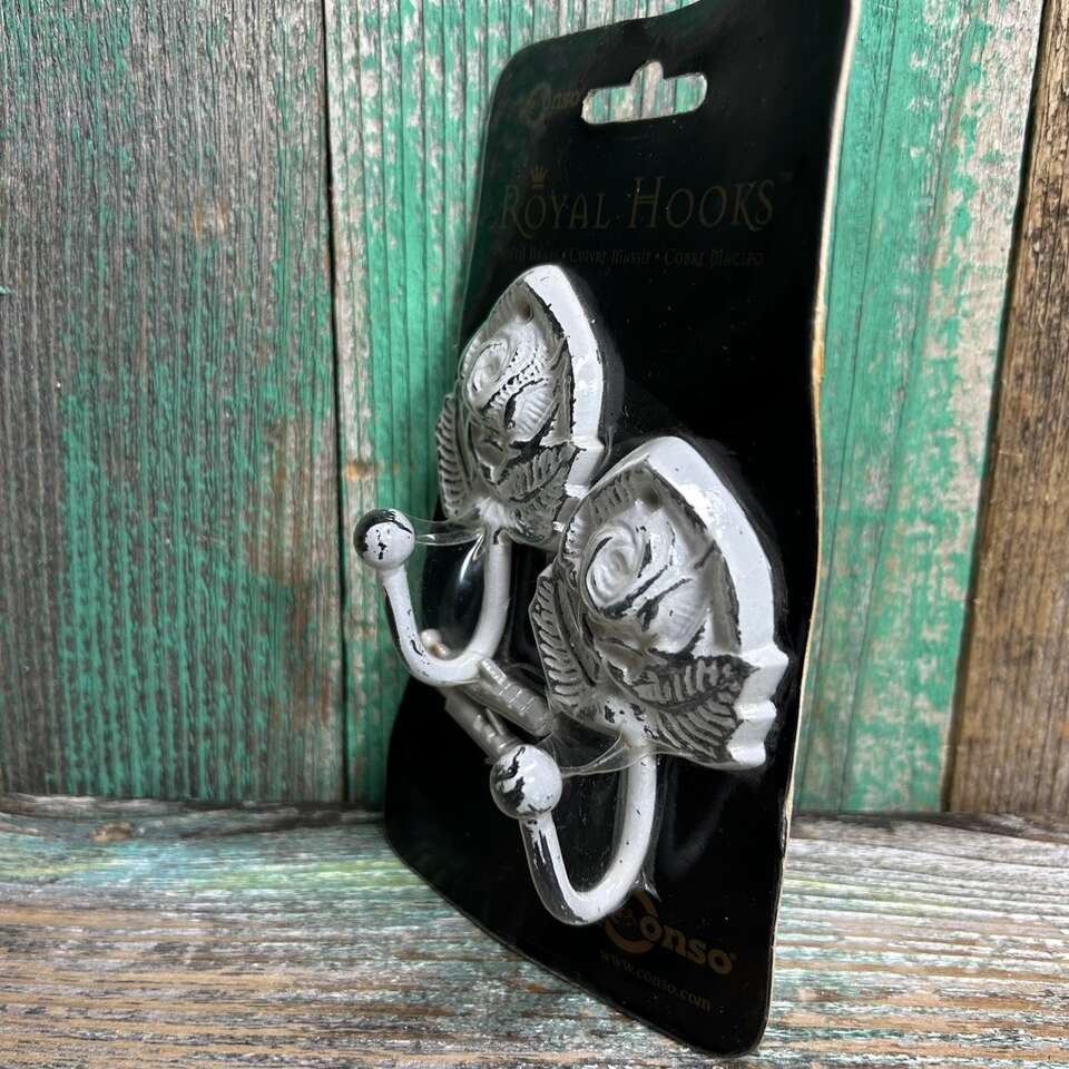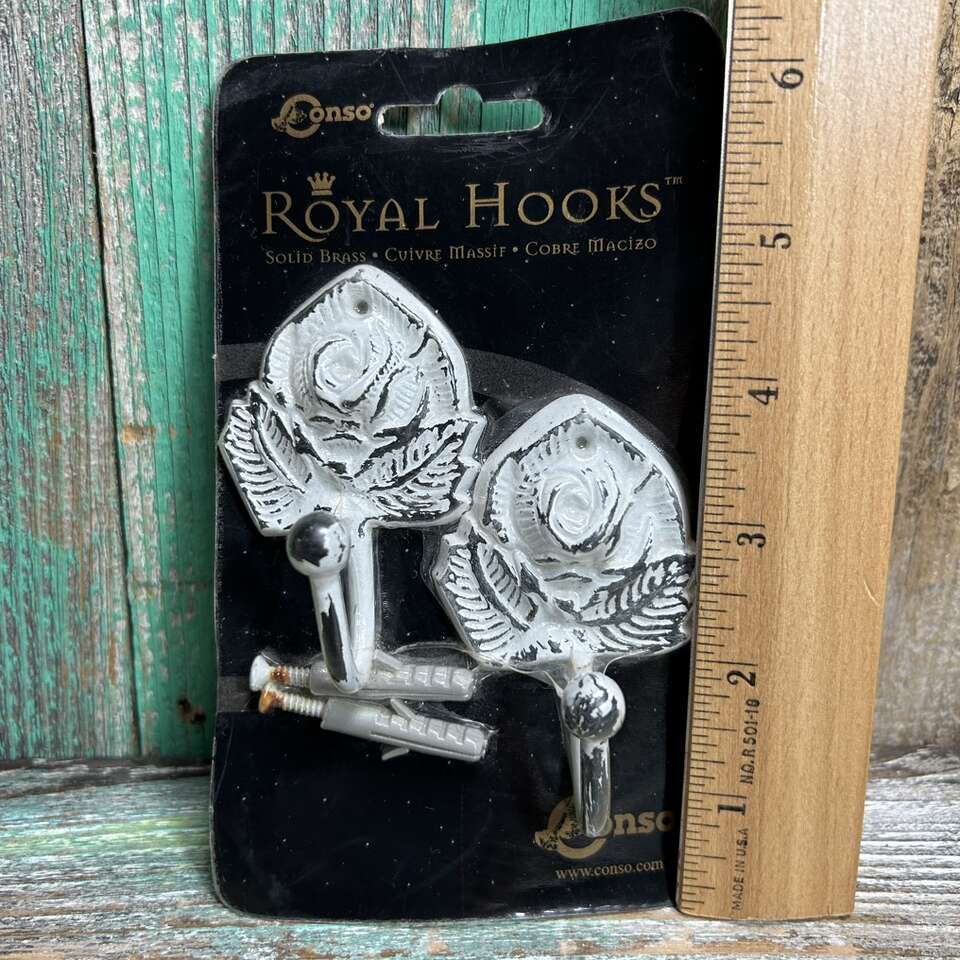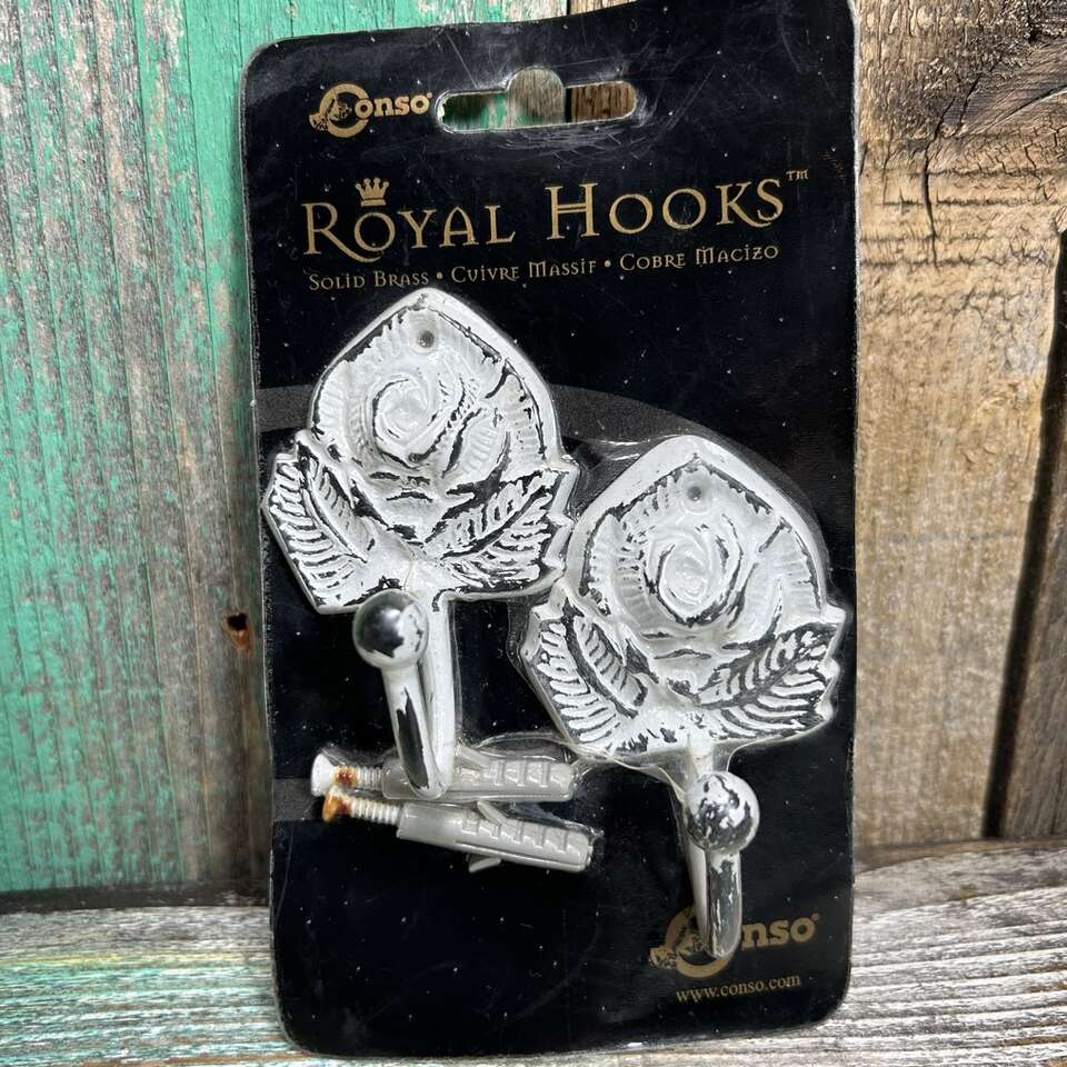 RARE NEW NOS (New-Old-Stock) Solid Brass Rose-Shaped Wall Hooks still in original package. Distressed white and grey paint to look like vintage steel. Made by Conso: Royal Hooks which apparently has gone out of business. Made in India. 3” Tall, hook extends a full inch. No defects except for the packing being old and the screws have spots of rust- you’ll want to replace them. Smoke free. Photographs are of the exact item you are buying. Delivery available to a convenient location when in your area for $5.