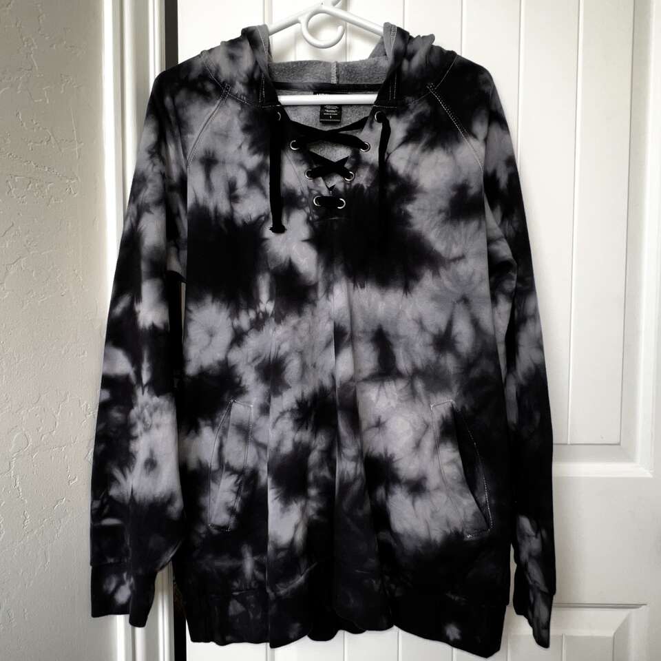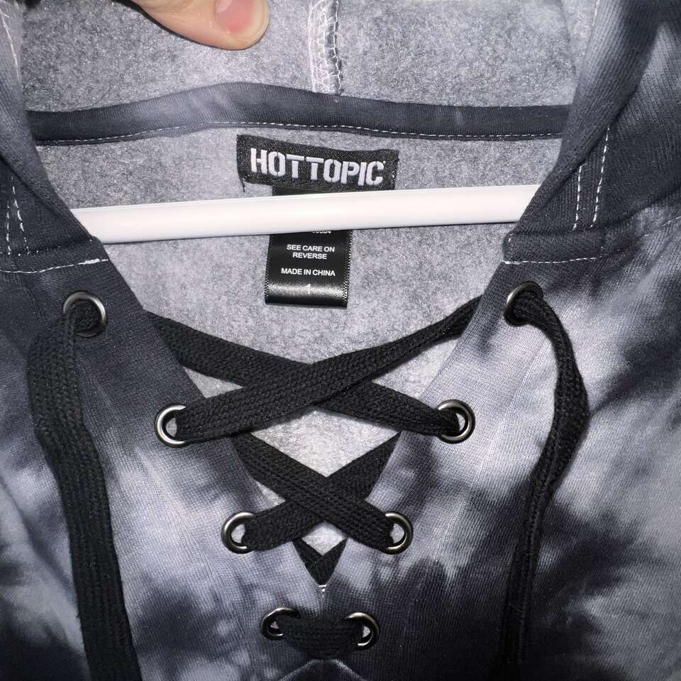 Price reduced from $35 to $25. Worn once! Like new. Bought from Hot Topic for $49.90. Lace up collar, drawstring hoodie with two hip pockets. 80% Cotton, 20% Polyester. Wash in cold and hang to dry. Cash only. I do not use payment apps.