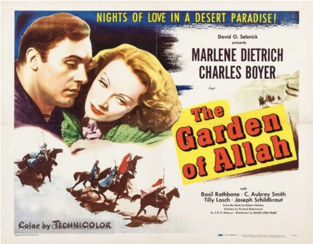 Details: A tale of adventure and romance set in the Sahara Desert. French Algiers and French Tunis. So popular, the book was later written into a stage play and then a screenplay for film. It was The basis for three movies, including the 1936 classic by David O. Selznik that starred Marlene Dietrich and Charles Boyer. The title also graced a famous Hotel on the Sunset Strip from the 1920's through the end of WWII.