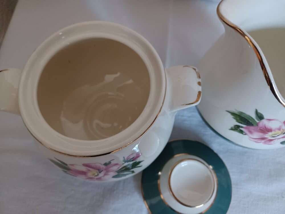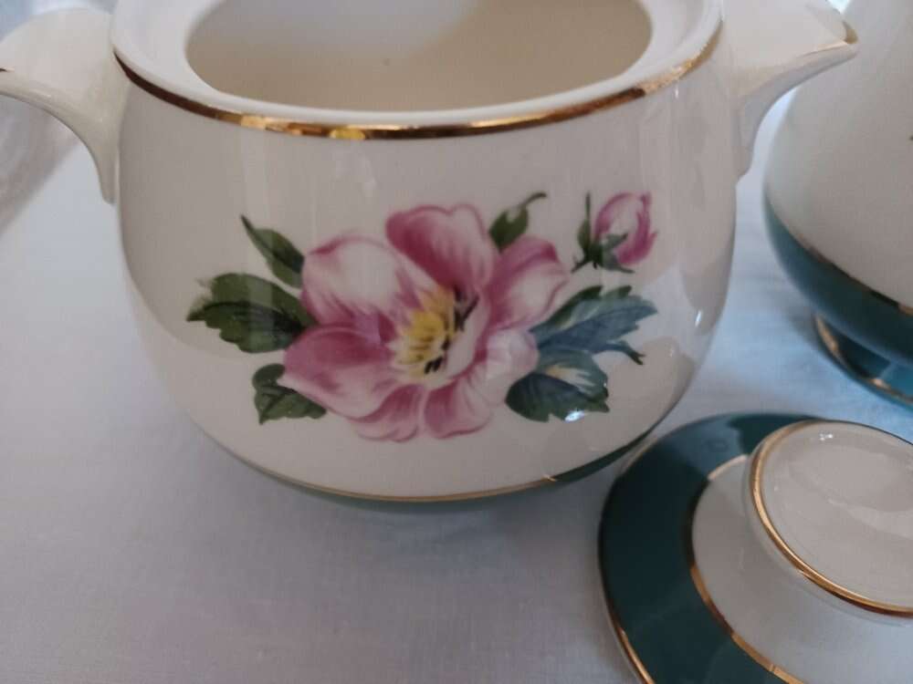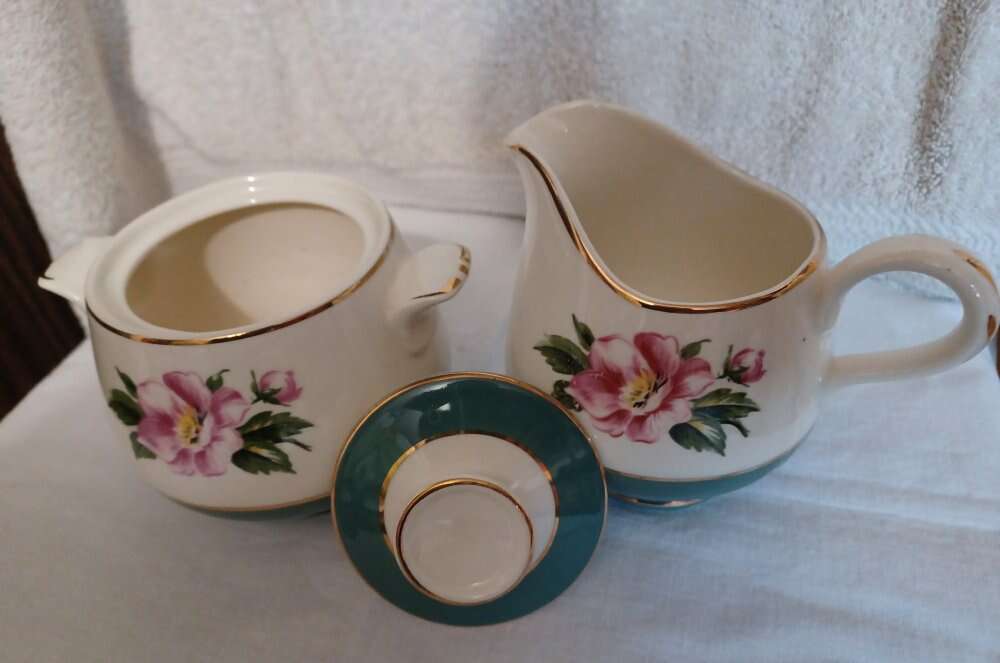 Vintage Homer Laughlin creamer and sugar bowl set. Cavalier design. Turquoise Empire Green Floral Romantic (with pink rose blossoms). Mid-Century 1950-1959 Perfect condition $15 Cash for the set Porch Pick-up in North Salt Lake city by Bountiful