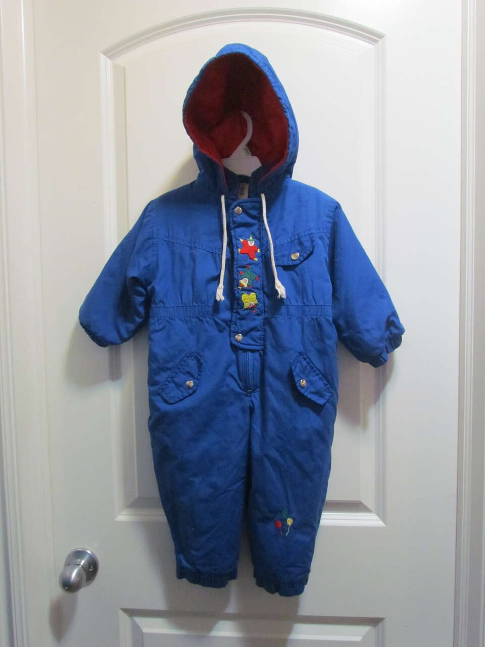 $10 Toddler Blue (w/clown decals) Snowsuit Size 12-18 Mo. - Good pre-owned condition.