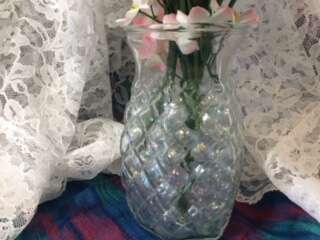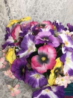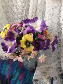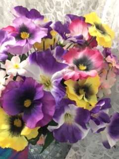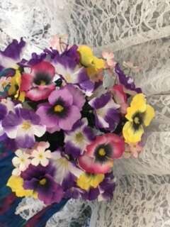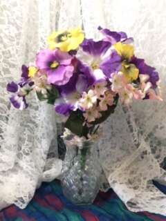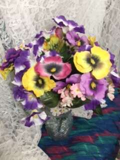 Beautifully colored, small flower arrangement of various Pansies and smaller pink flowers displayed in a 5 1/2 x 3 x 3, textured clear vase with iridescent stones within giving shimmers of color off in the light. The entire arrangement stands 13” tall. Asking $20.00.
