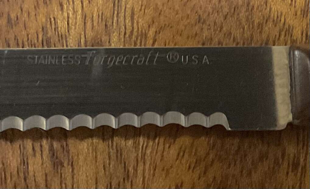 LOT of 5 Vintage Forgecraft Serrated Stainless Steak Knives Wood Handle With knife block. Made in the USA Please take a look at my other listings