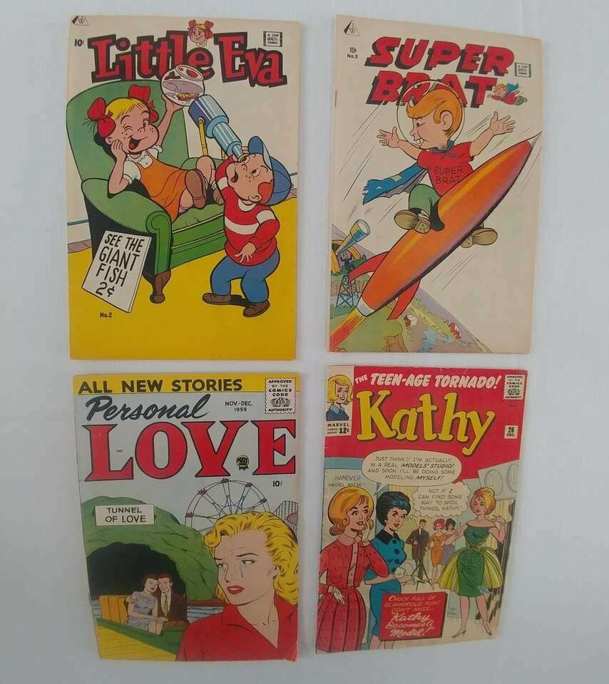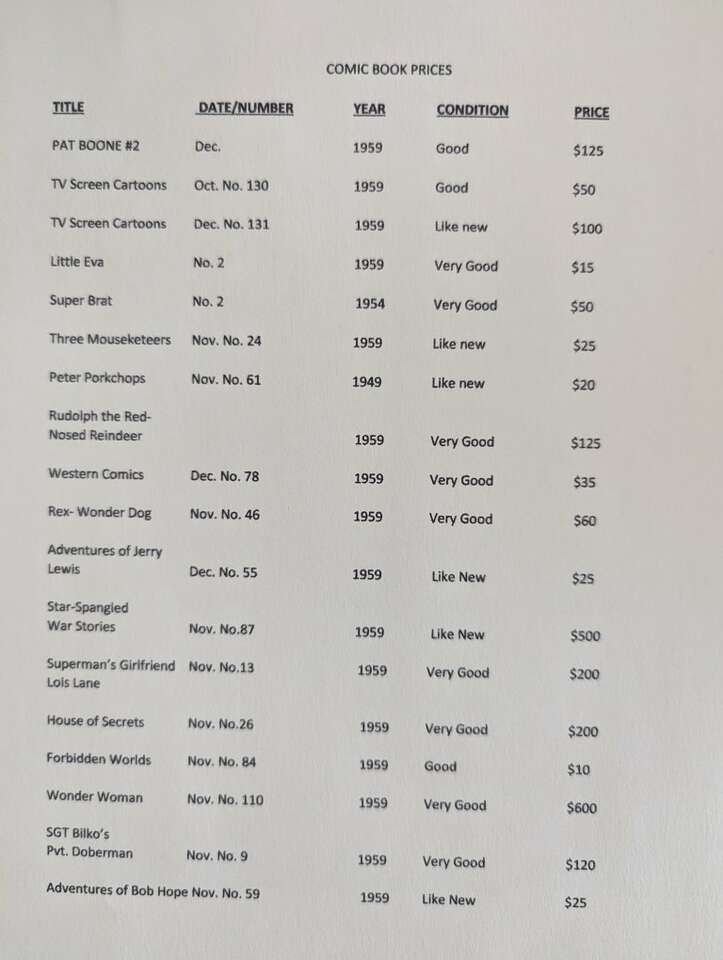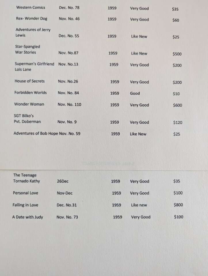 These vintage comic books range mostly from 1959 with one from 1949 and 1954. They are all in very good to almost like new condition. They are all intact with covers and staples. There are a few creases in a few of the books and a couple slight tears in a couple that haven't had any repairs with tape. For you comic book lovers, there's a nice variety to select from and make it part of your collection. Prices vary according to titles. I have checked on line and am making comparable prices. Remember online prices add shipping charges. Some are out of print (OOP) creating higher mark-ups. (See price list in images). Accept cash only please.
