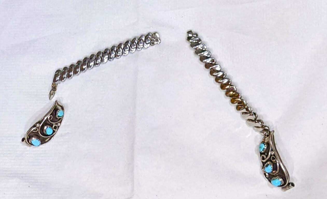 2nd picture, with 3 turquoise beads on each end. approx. 7" long. The band has a broken link (see picture) for $30