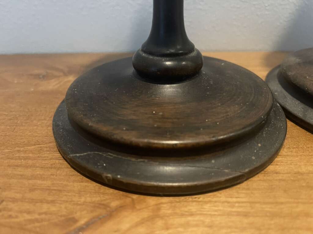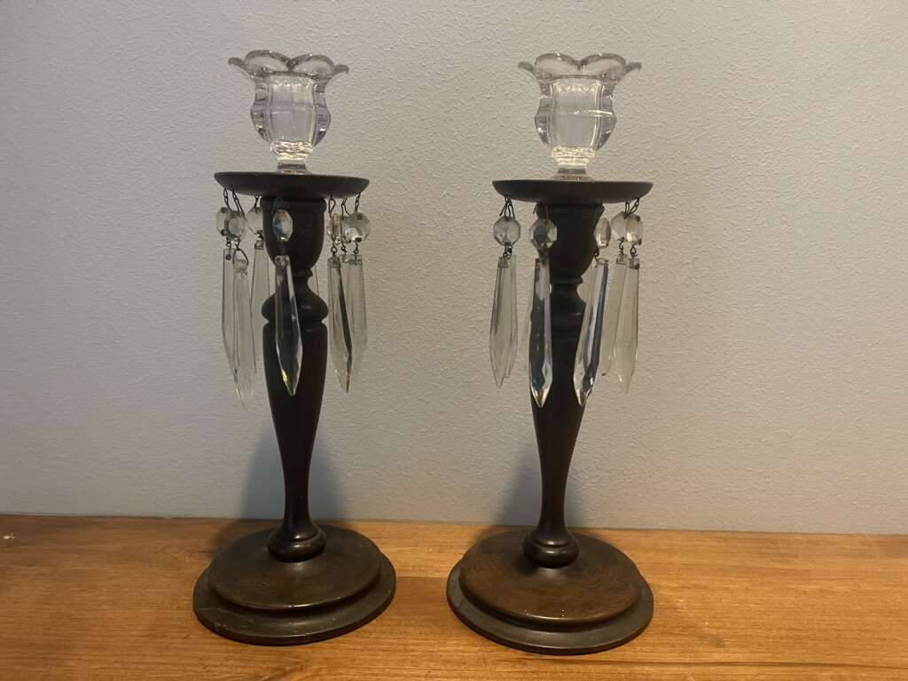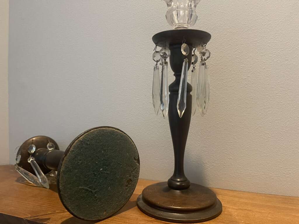 Eye Catching - 12” Tall Dark Walnut Wood Base & Pedestal Green Felt Bottom Pendant & Icicle Crystal Chandelier Prisms Crystal Candle Cups Cash & Carry