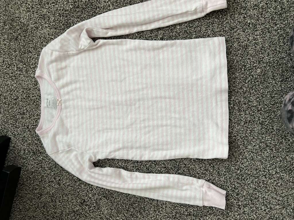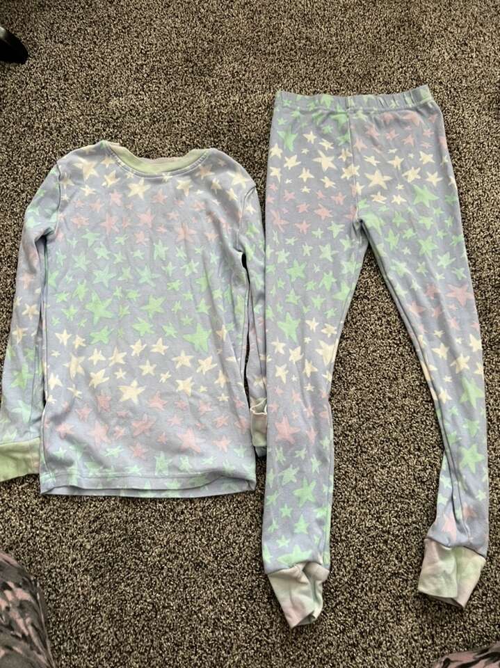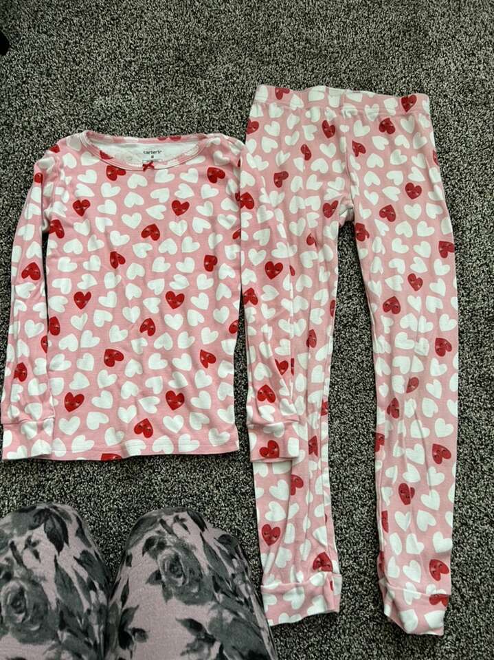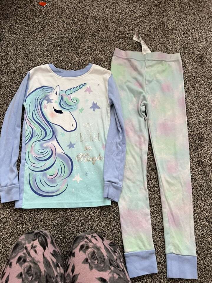 4 sets of long sleeve, long pant pj sets. One extra top, not sure what happened to the bottoms? Valentines and unicorns.