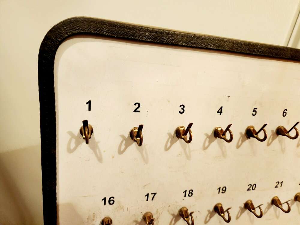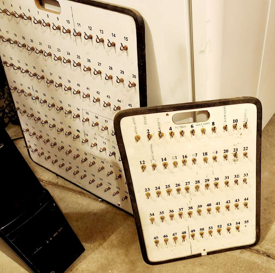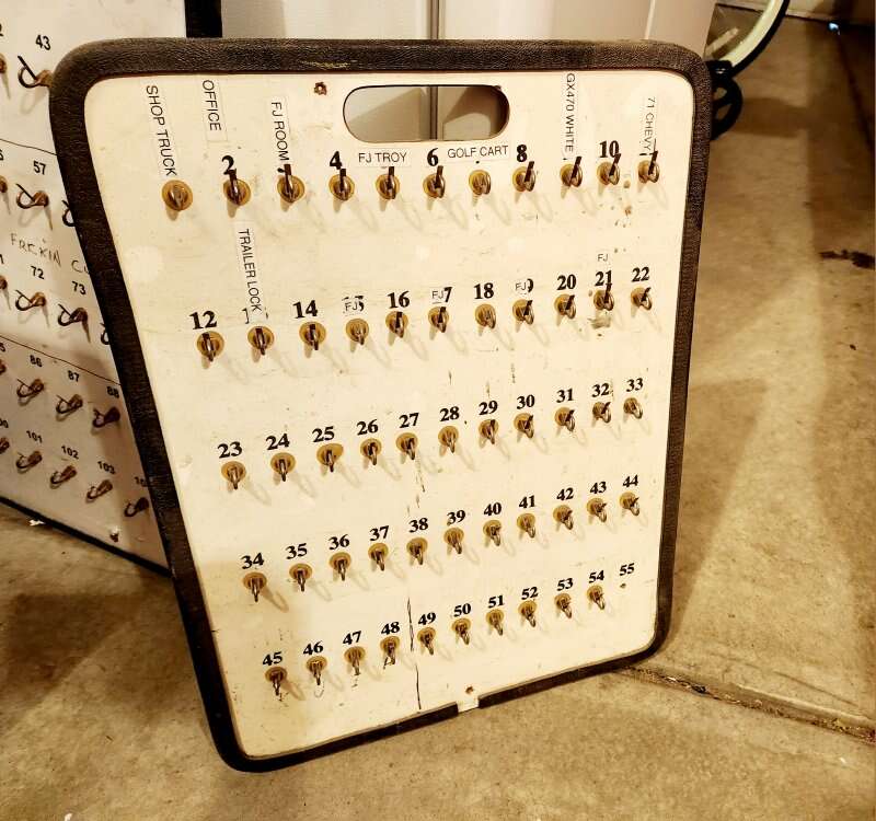 Large board $55 Easily organize up to 105 (missing 1 hook) keys to your vehicles using the convenient hand grip on this portable keyboard. Made of masonite with steel reinforced black vinyl trim to protect edges. Rows are offset so keys do not hang on top of each other. Gold colored hooks have spring lock safety catches so keys cannot accidentally fall off. Size: about 32" tall x 29" wide