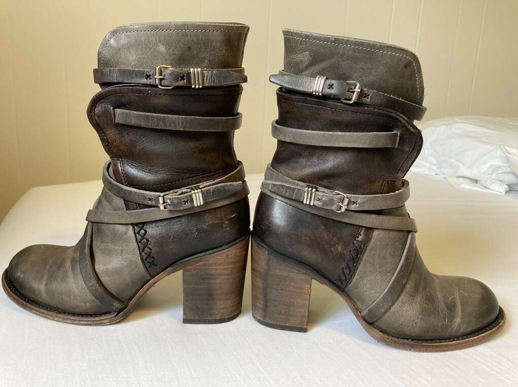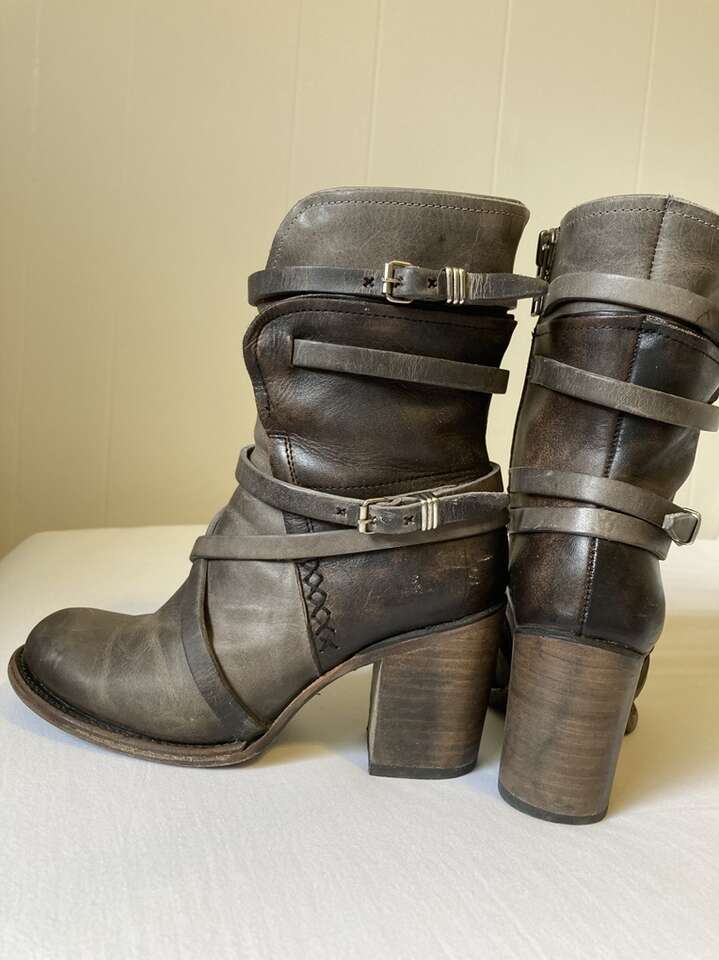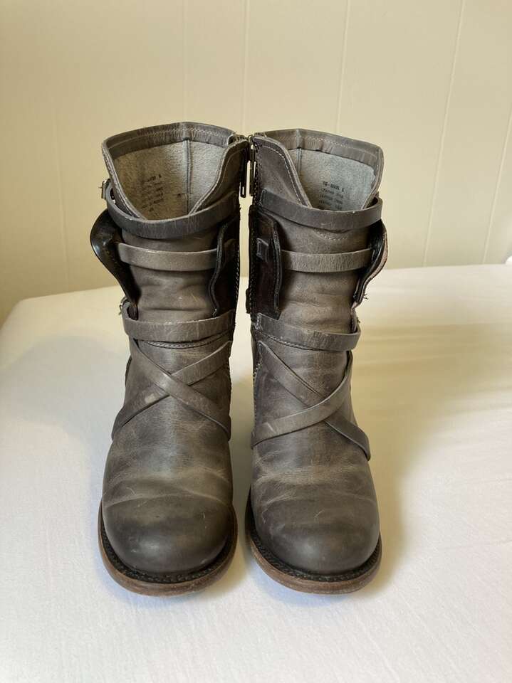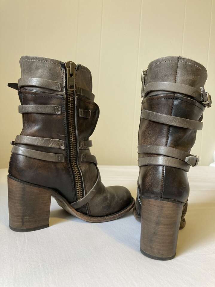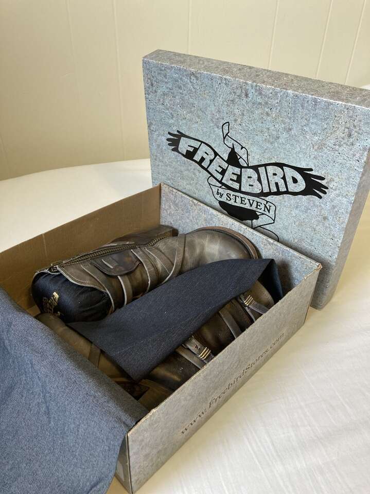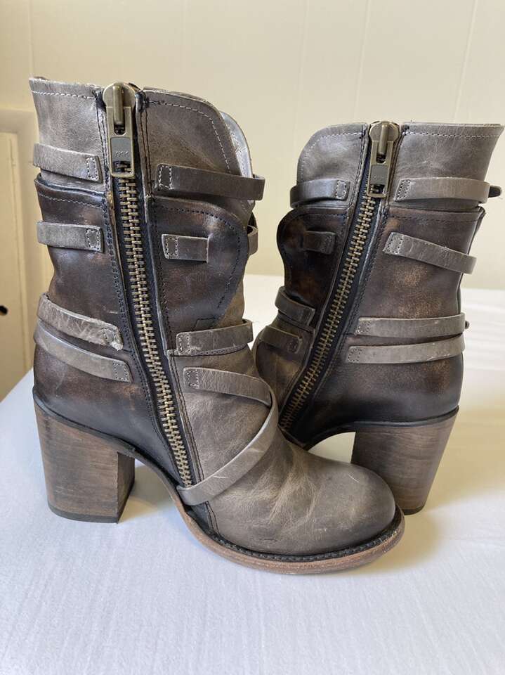 VenmoUsed Freebird Baker boots (Steve Madden). Genuine leather, color is called stone (gray and dark brown mixture). Great condition overall; only worn a handful of times, but still look, feel, smell brand new. Comfy for taller heeled boots, and the boot reaches the bottom of my calf, so they are great for any season, and look super cute with pants, shorts, and dresses. Can be dressy or casual depending on your outfit. True to size. Retailed at $325 when purchased.