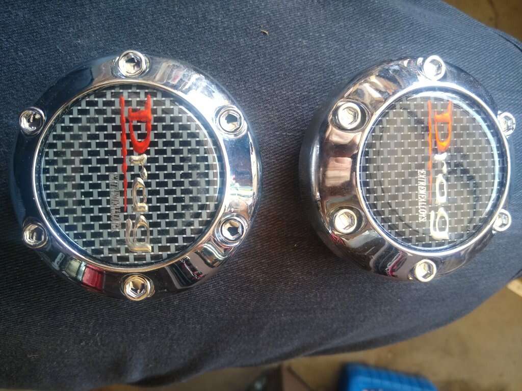 Two new wheel center caps. Made for after-market Drag Extreemalloys wheels. Sold as a pair for $40
