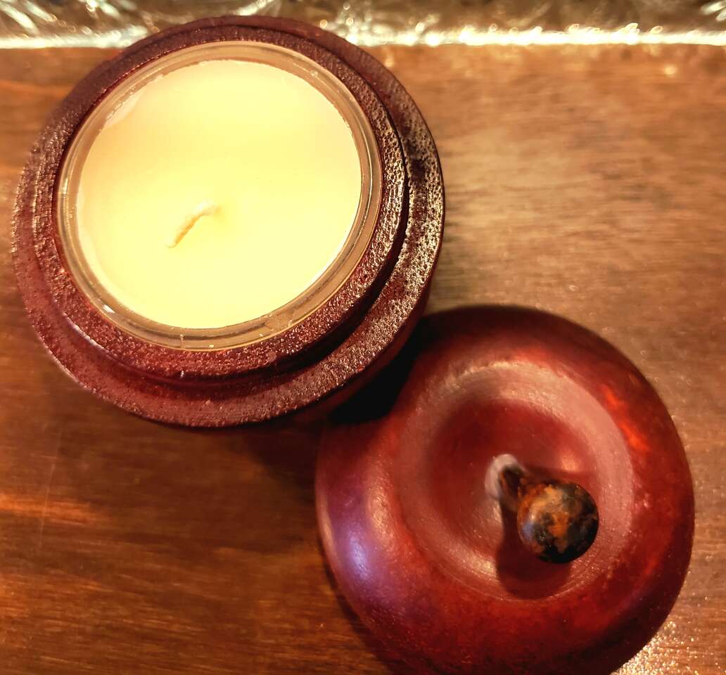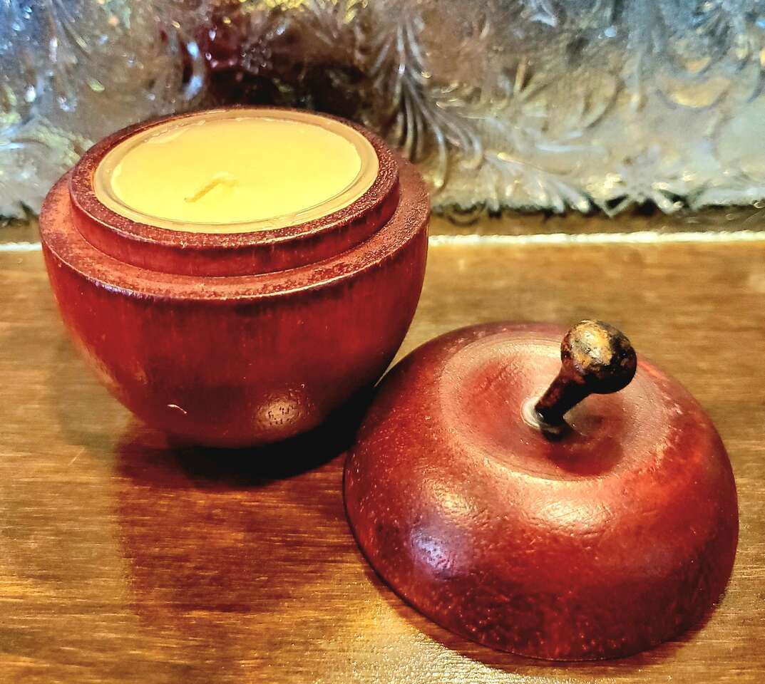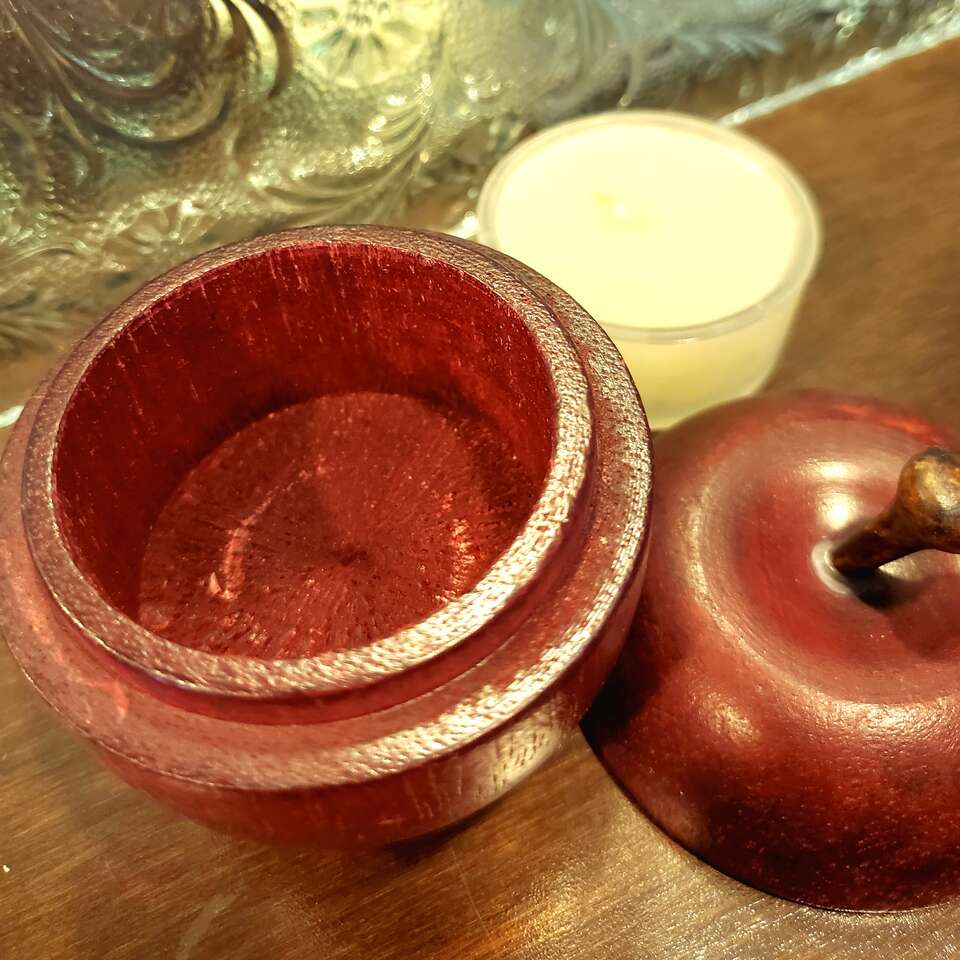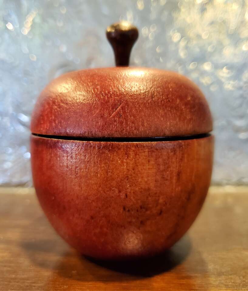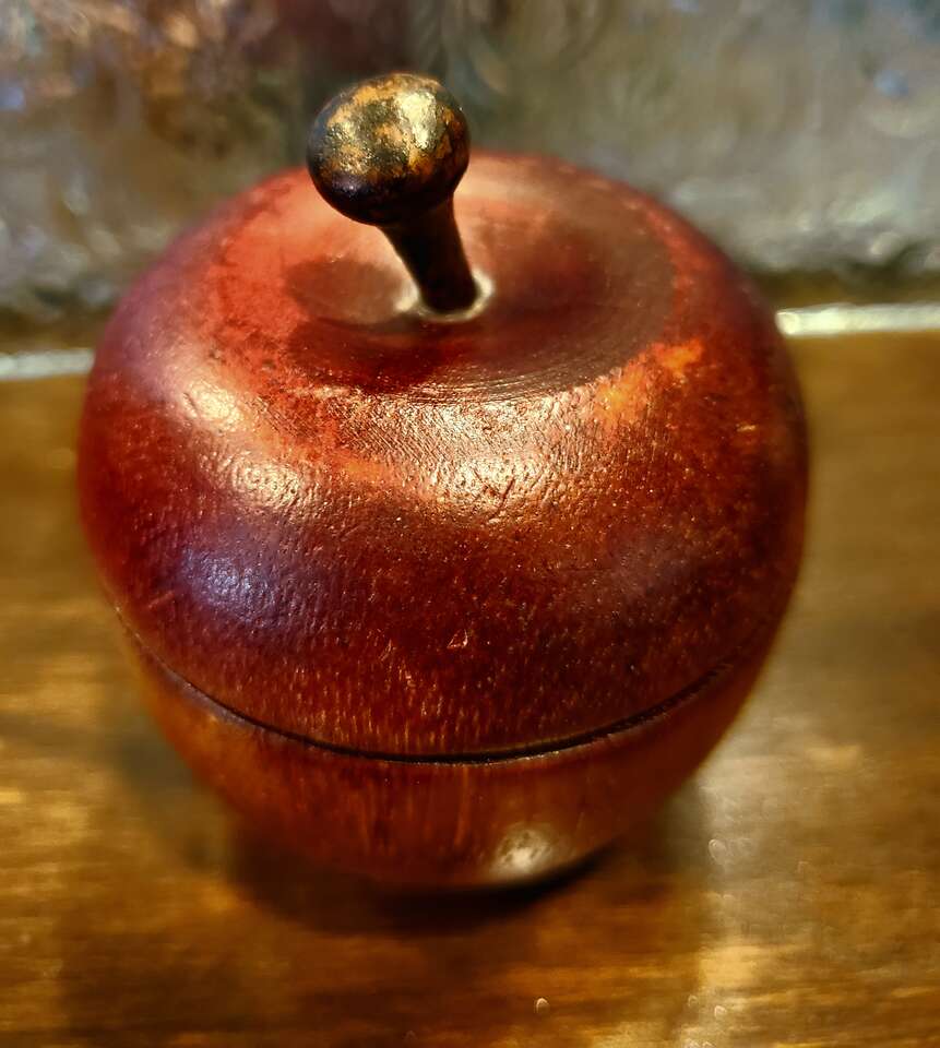 Red Wooden Apple Shaped Trinket Box, Cache, Tea Lite Caddy, Container. 3" Tall. Cash Only, No Codes.