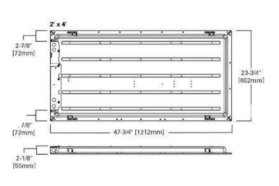 Over 4,800 Lumens, replaces up to 96-Watt of fluorescent lamps Acrylic micro optics provide uniform illumination from corner to corner Light-weight, post painted die-formed steel housing for durability and finished aluminum trim Weighs only 10 lbs. and includes everything you need to get up and running and meet code requirements Thin 2.13 in. H, fits in shallow plenums with room to spare 0-10-Volt dimming to 10% using purple and grey low voltage wiring Assembled Depth (in inches) 49.99
