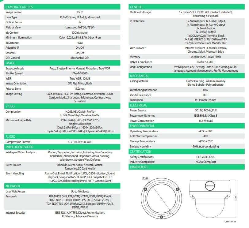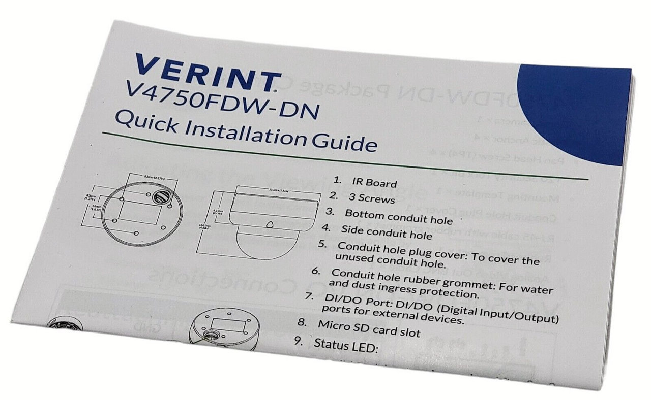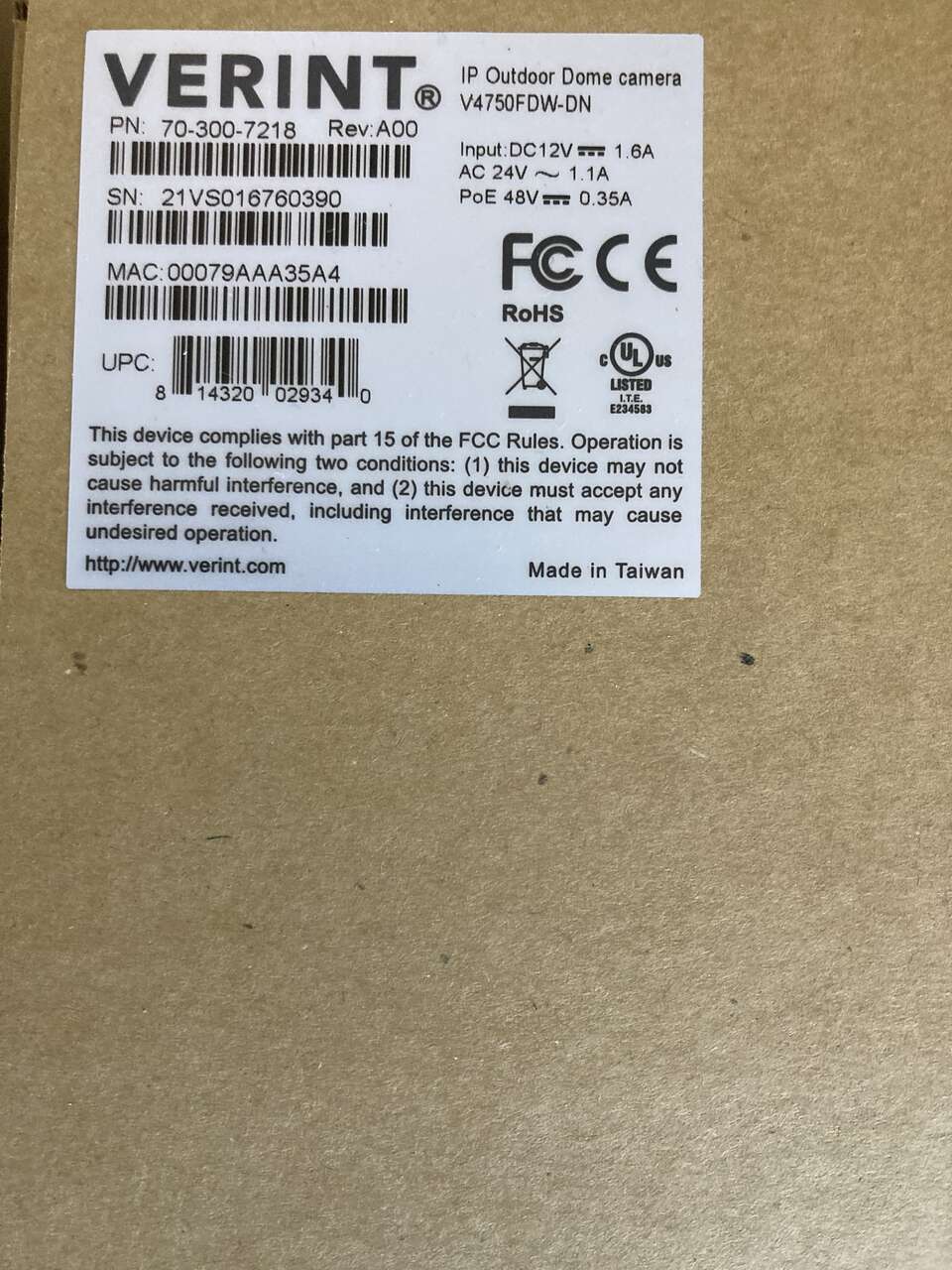 Item# 722 $50OBO Item# 723 $50 OBO (2 Available) New Unopened Dome Camera Model: V4750FDW-DN & Mounting kit IC-004 P/N: 70-311-0605 The Verint V4750FDW-DN is a brand-new professional H.264/H.265 network dome camera offering a maximum resolution of 2592 x 1944 (5MP) at 30 fps. The V4750FDW-DN is a powerful camera that can be used in indoor and outdoor applications and features high resolution images, Wide Dynamic Range (WDR), Remote Focus and Zoom, Onboard Analytics and a built-in MicroSD slot for onboard storage. Using AdaptiveStream the Verint V4750FDW-DN network dome camera can reduce bandwidth and storage consumption while maintaining high image quality. True WDR capability allows the camera to capture both the dark and bright areas of an image, combining the differences to create a highly realistic representation of the original scene. The onboard analytics suite features essentials like Trip Wire, Object Left Behind and Loitering which can be used to alert a user to a potential problem in the field. Most importantly the Verint V4750FDW-DN network dome camera is fully integrated into our Verint’s EdgeVR® platform. With this powerful integration, users can now operate the camera from the EdgeVR platform to adjust and maintain over its life. Some of the features and advantages of this integration include easy installation with Auto Camera Config, Remote Password and Firmware updates, HTTPS support for secure connections, integrated camera image adjustment, Audio support and SD Card backup feature which prevents loss of video in the case of a network disruption.