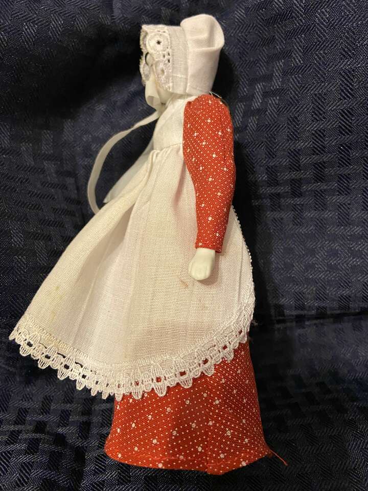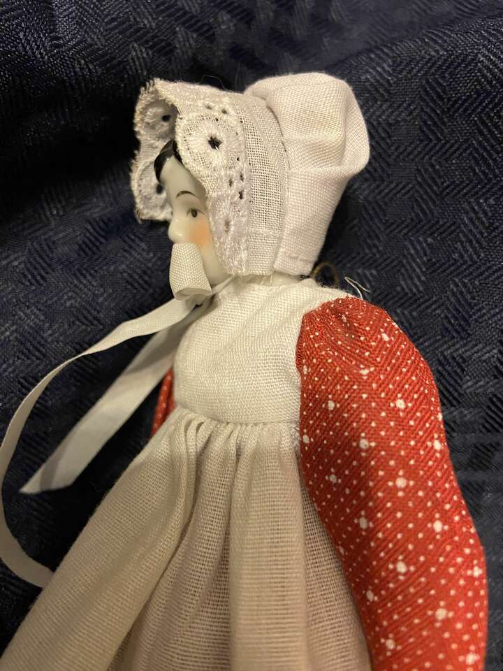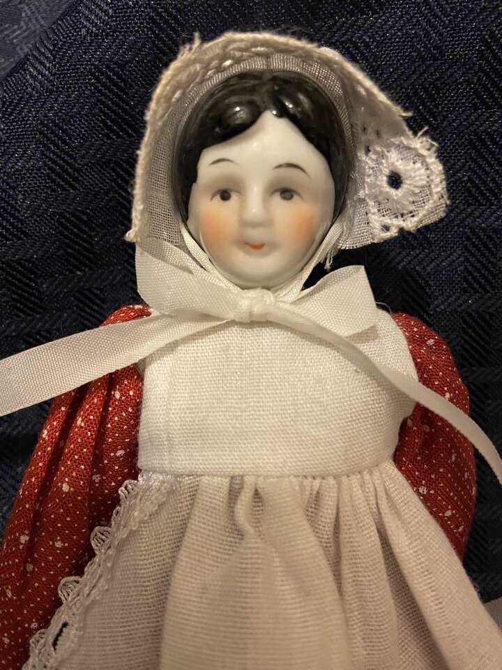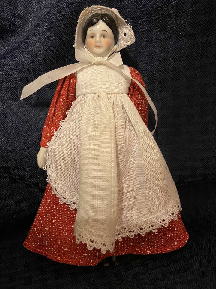 VenmoBeautiful porcelain doll, she might be antique. I do not know where she was made. She is adorable wearing a red dress with white pinnafore, panteloons and bonnet.