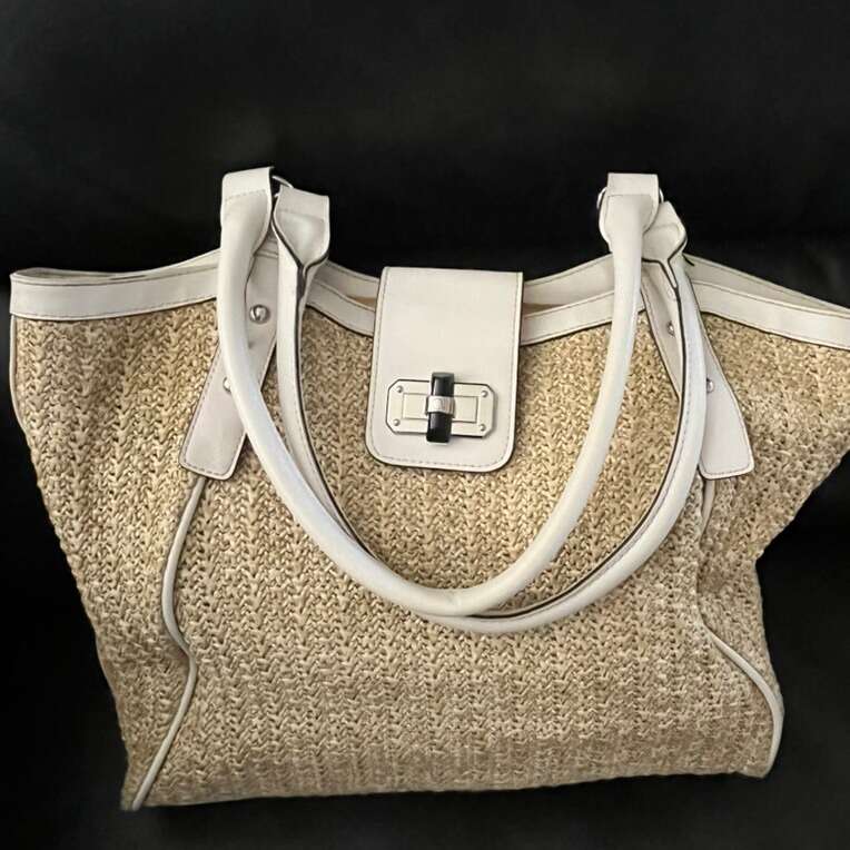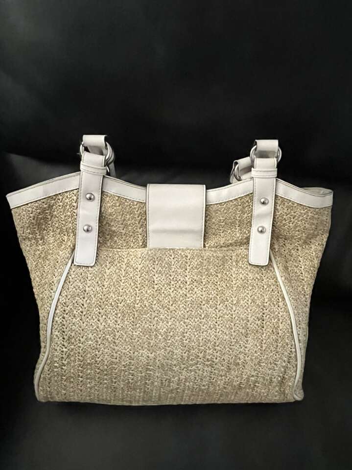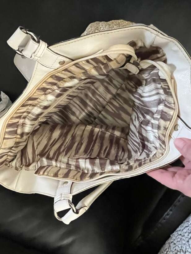 White & tan roomy, zipper closure & several interior pockets in the lining; as well as a large exterior pocket.