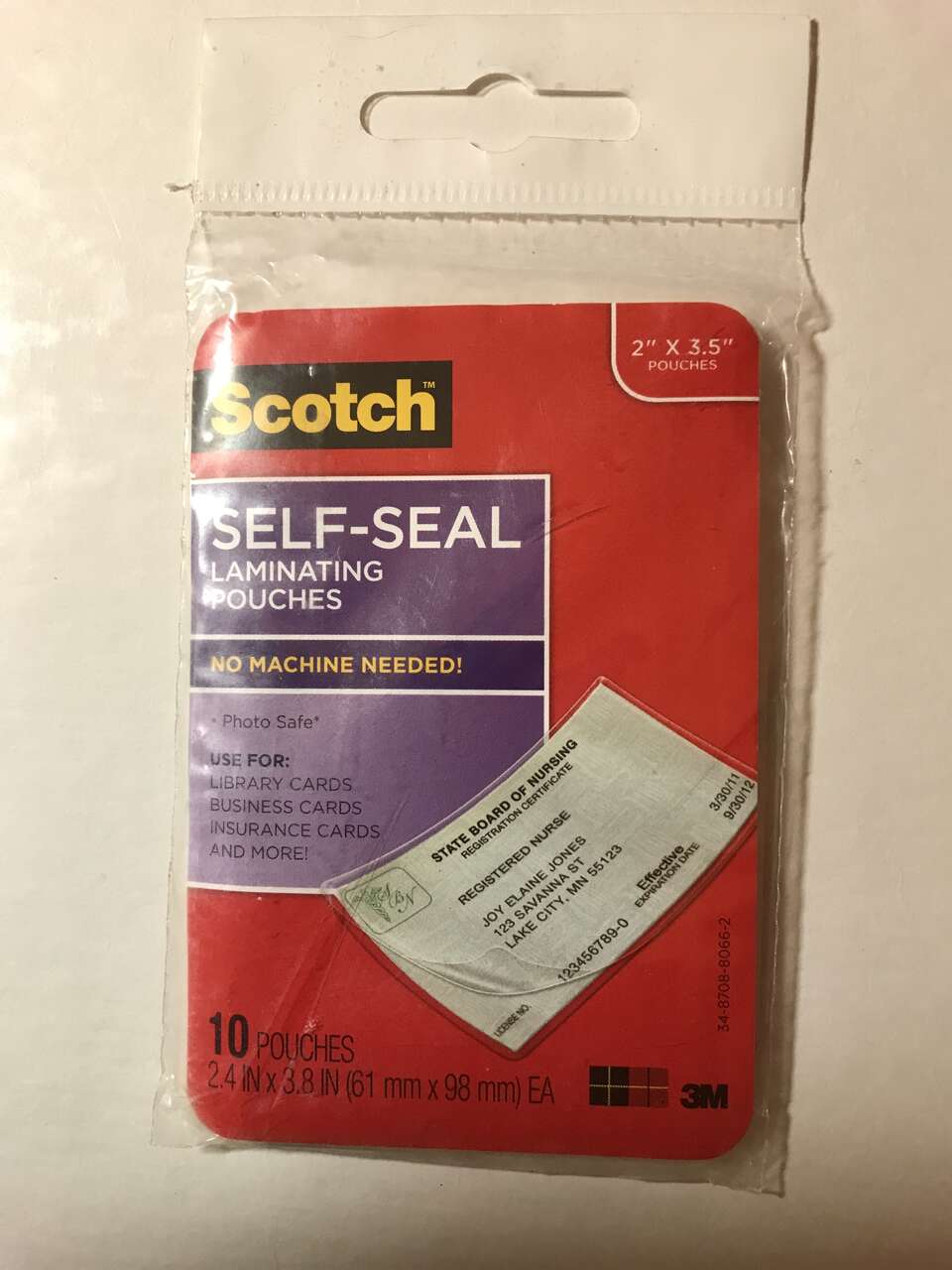 Scotch 10 pouches - 2" x 3.5" Self-Seal Laminating Pouches, new. Use for Library card, Business cards, Insurance cards and more.