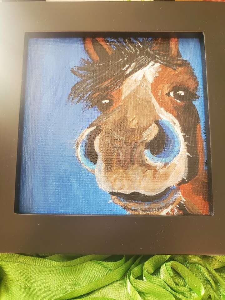 4"×4" acrylics painting on flat board canvas, "Rose the horse". Black framed. New Can be hung up or placed on a table.