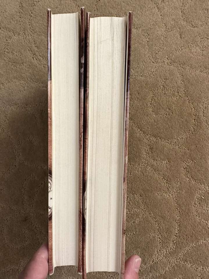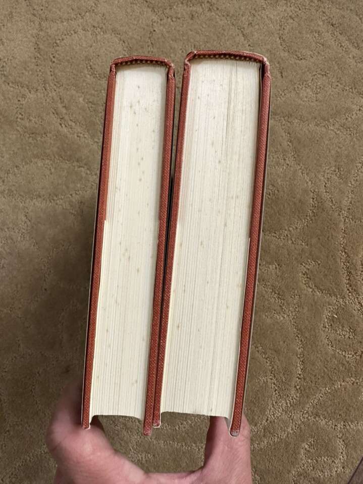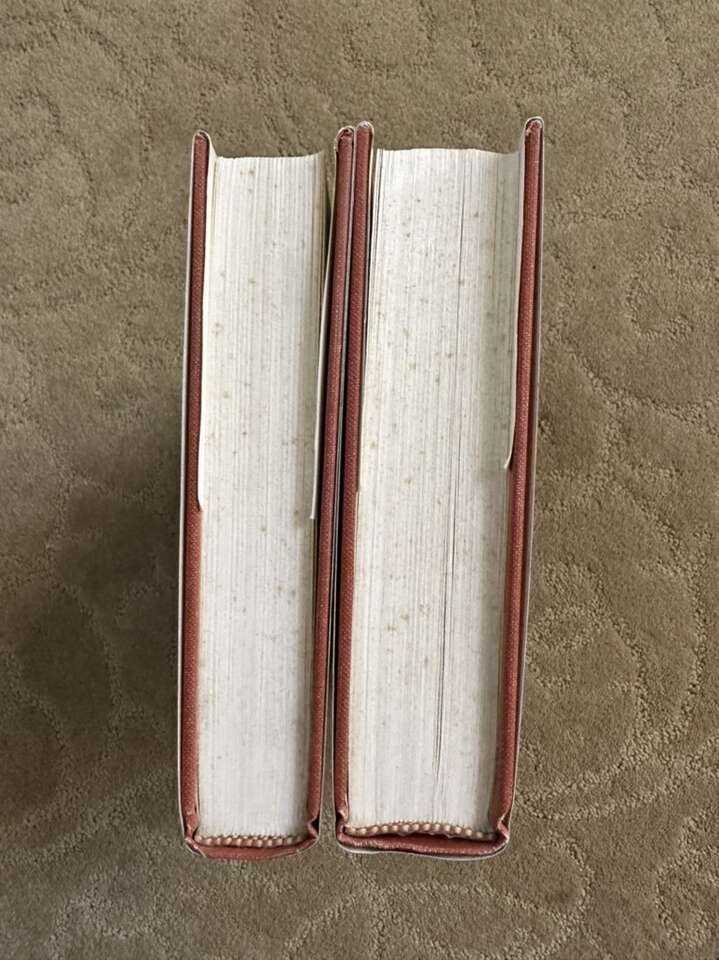 No markings at all except former owner name stamp in both volumes. Light foxing on the top and bottom of the text block. Laminate dust jacket protectors.