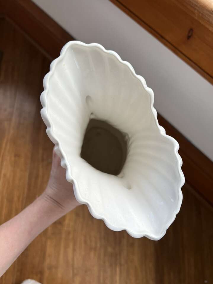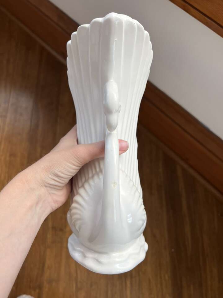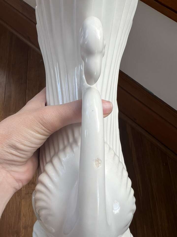 VenmoMaddux of California double swan vase, approx 9 1/2 tall and 6 3/4 at widest, opening. This vase is in great used vintage condition from the 1940s-1950s. There’s a small nick on one of the necks on the side. I remembered it had a small flaw, but it took me a while to find it. It’s hardly noticeable. Crazy to think this has been around 80 years. I paid $80 for this beauty. They are rare and hard to find.
