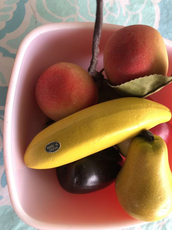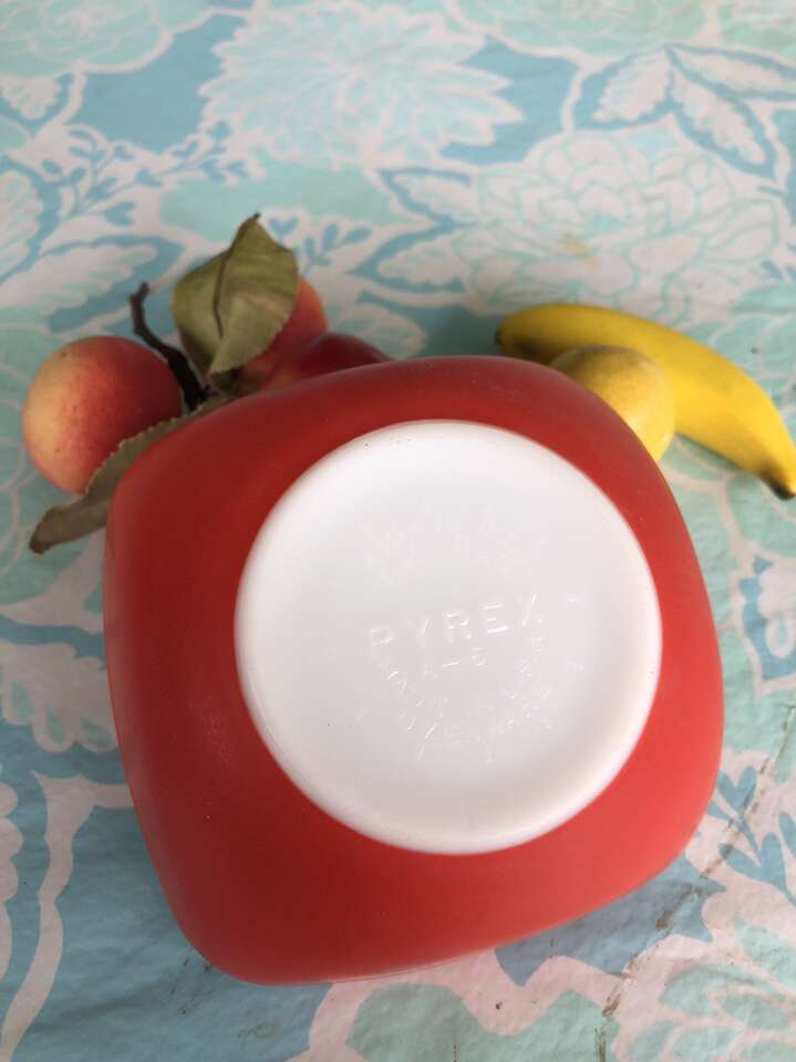 Pyrex bowl is small, about 6” measured diagonally. Small Japanese artificial fruit. All from 1960’s. Cash only. No codes or scammers.