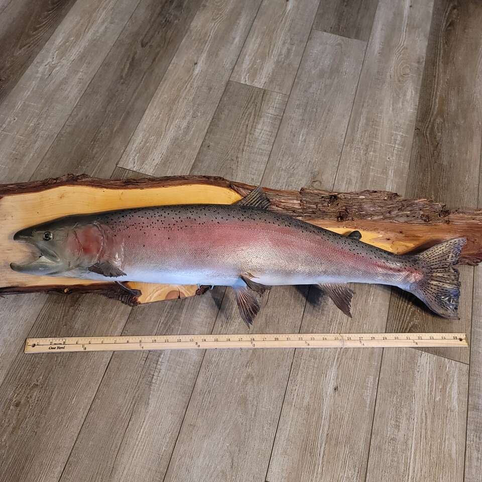 Taxidermy 36" Rainbow Trout fish real skin mount with wood slab backing w/ mount on back for easy wall mounting. Fathers day, birthday day, son, grandfather, grandpa gift!