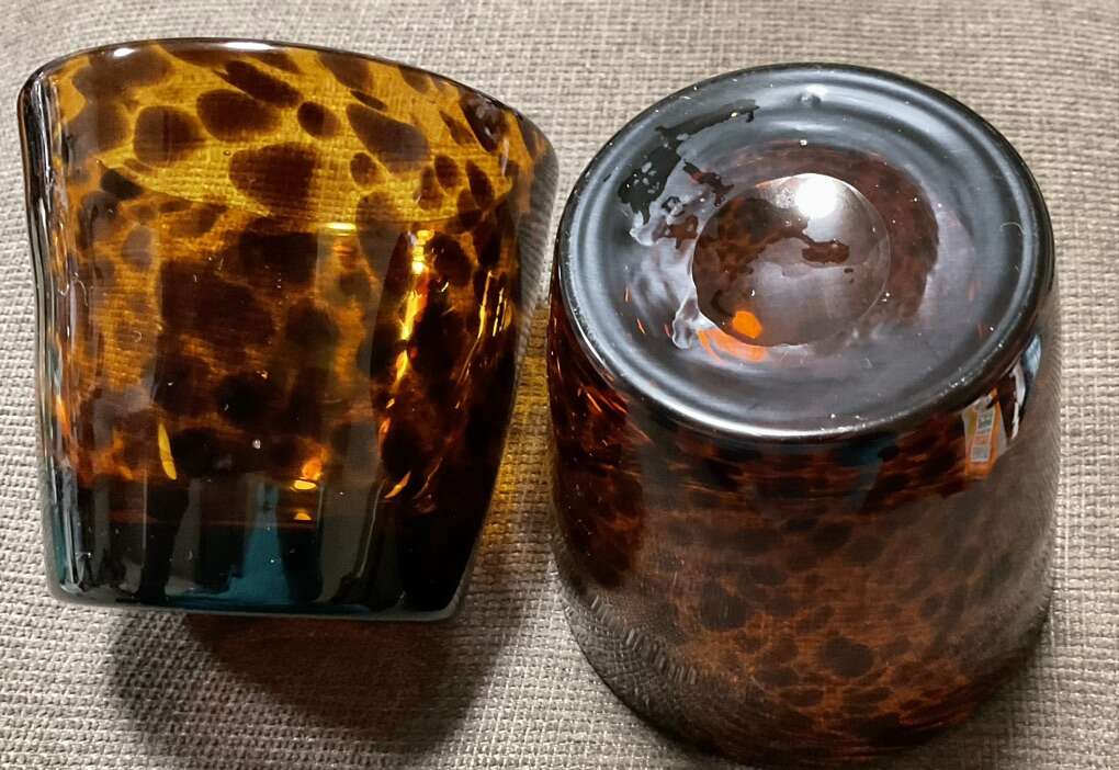 Mid Century Hand Blown Tortoise Glass Tumblers Set Of 2. 4” tall. Beautiful Please take a look at my other listings