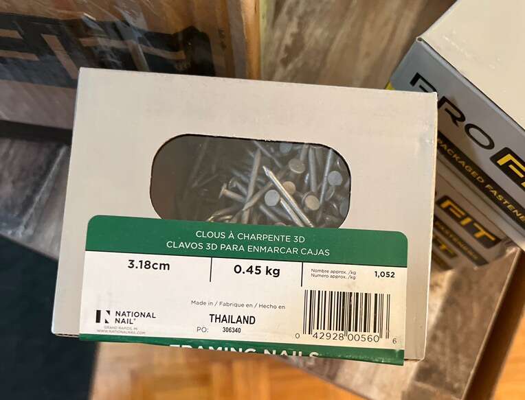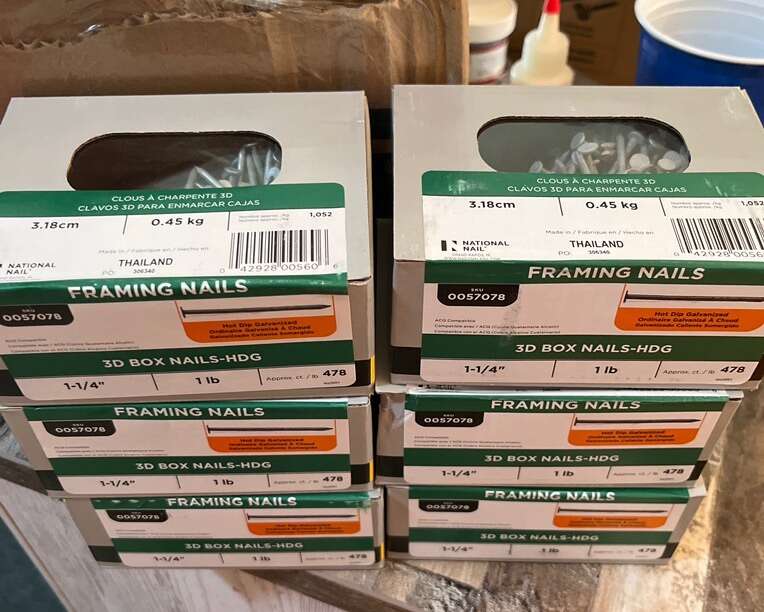 6 boxes of 3D framing nail-HDG. 1 1/4” profit nails. 6 boxes of 1 lb nails.