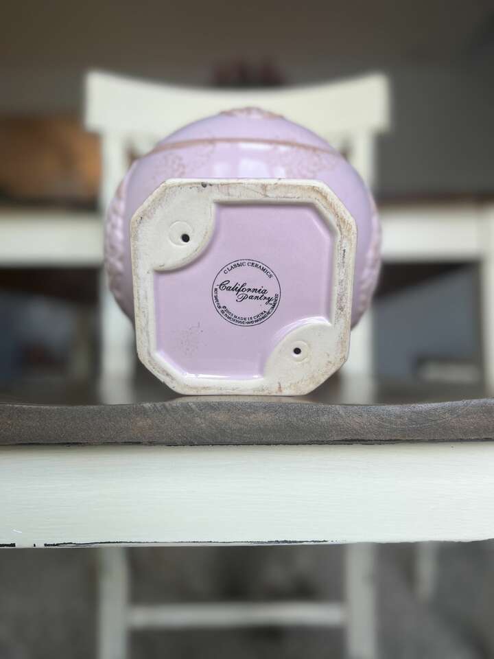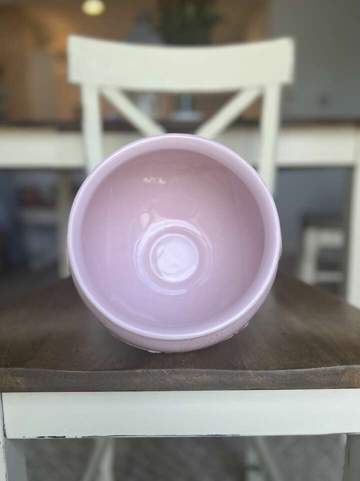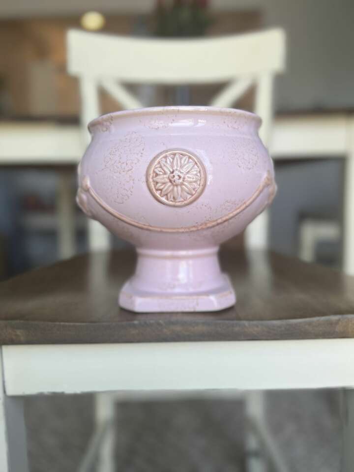 Perfect Condition! About 7.25 tall with a 7 opening, bowl cavity 5.5. It has molded floral swags and a floral medallion around the exterior. Pink gloss glaze with antique brown sponge paint accents. No chips, cracking, crazing or repairs. I have found this online in cream or cream with a hint of pink, but this one is a deeper pink. It is just gorgeous! This is from the Classic Ceramic Series. CASH ONLY! I do not use payment apps.
