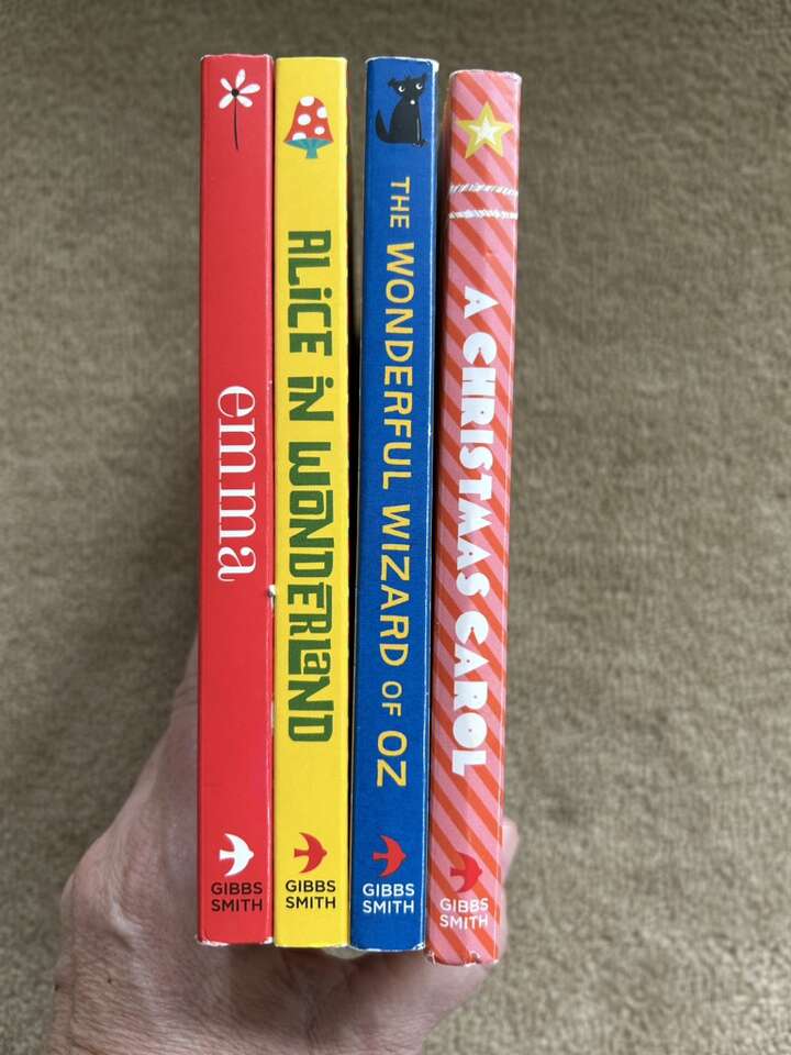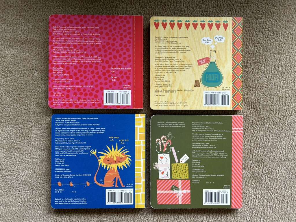 Four BabyLit board books, by Jennifer Adams, illustrated by Alison Oliver. Emma, Alice in Wonderland, The Wonderful Wizard of Oz, and A Christmas Carol. 7”x7” (the larger size). Very good condition—slight wear on edges (see photos). Text only. Cash or Venmo. Discount on multiple items.