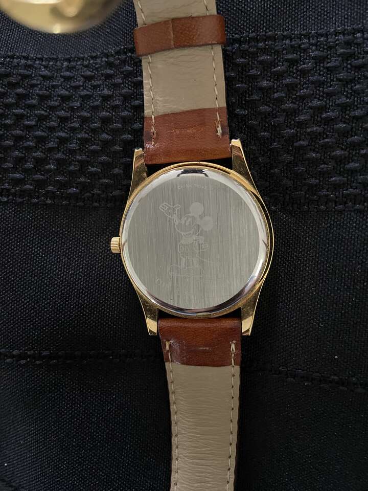 This colorful quartz watch was made by Pedre for The Disney Store in the 1990s; at the center of the face is a smallish dial and on the interior of the crystal are scenes of the Seven Dwarfs' diamond mine on the left and cottage on the right. Cut-out images of the Seven Dwarfs marching in line rotate to tick off the seconds while moving from one destination to the other. The watch case has a gold-color finish and leather strap is a light brown. "An image of the classic pie-eyed Mickey Mouse and "China Movt / Disney / The Disney Store" are incised on the back of the case.