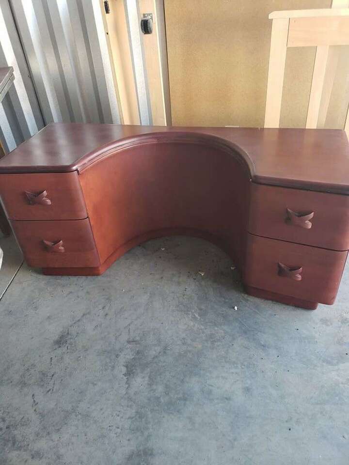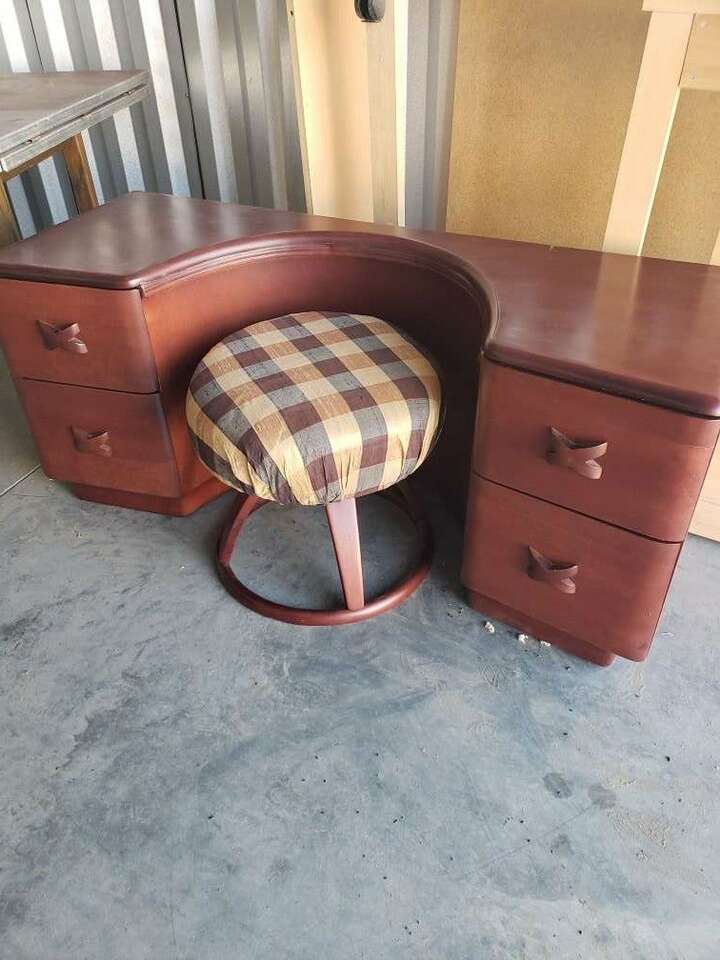 VenmoMid Century Modern HANDMADE 1950s Heywood Wakefield 'Rio' Vanity Dresser Set. Includes 3 pieces; Vanity, Cushion Swivel Stool, and Mirror. Dimensions; ︎ Vanity 49"W.x 17.75"D.x 21.75"H. ︎ Cushion swivel stool 17.25"H.x 17.50"D. ︎ Round Mirror 40" Diameter [approx] Vintage hand-made, durable solid maple wood, dovetail drawers. AUTHENTIC [stamped] Heywood-Wakefield, a leading brand of Mid-century Modern. Condition: EUC for a 1950's Vanity 3 piece set. #Maple Wood, #Bedroom, #Swivel, # Stool, #Vintage, #Furniture, #Dresser, #Vanity, #Round Mirror. $2695 orig./ reduced $2300. OBO REASONABLE OFFERS considered. Local pickup only!