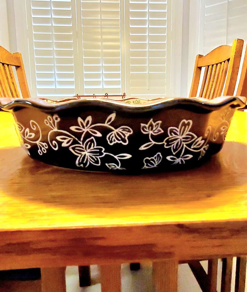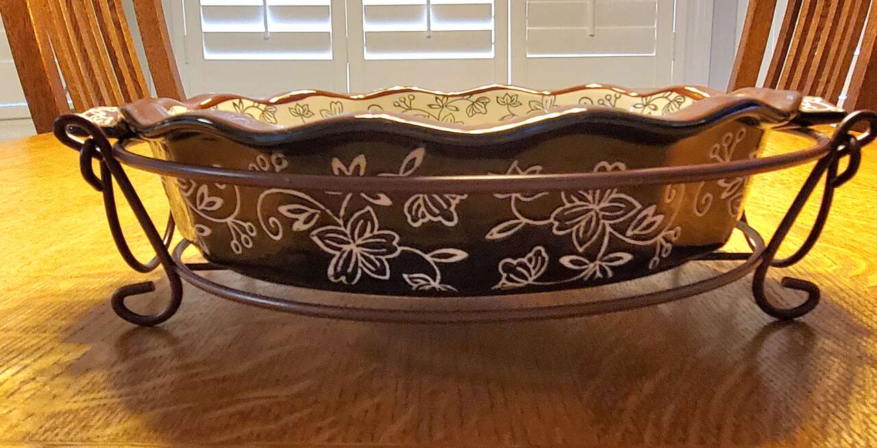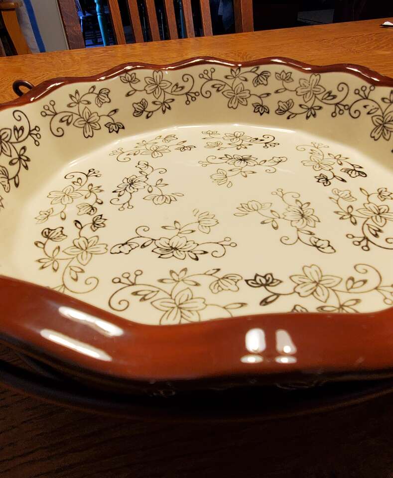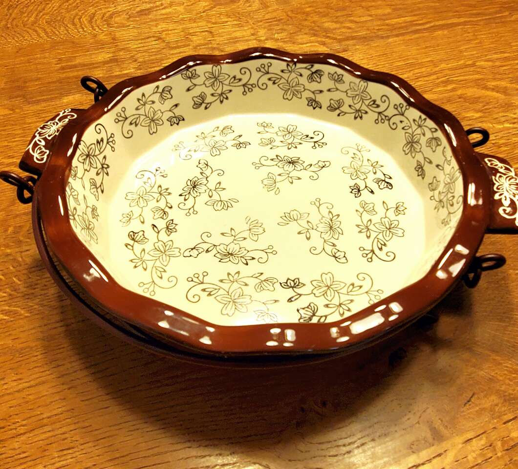 TempTations Presentable Ovenware Floral Lace Pattern Pie Dish with Rack Carrier. Cobalt Blue and Brown Ruffle Edge. Oven, Dishwasher & Microwave Safe. Cash Only, No Codes.