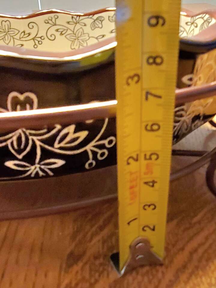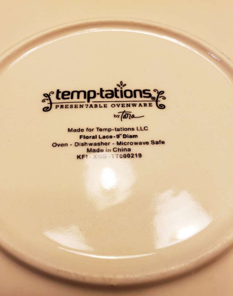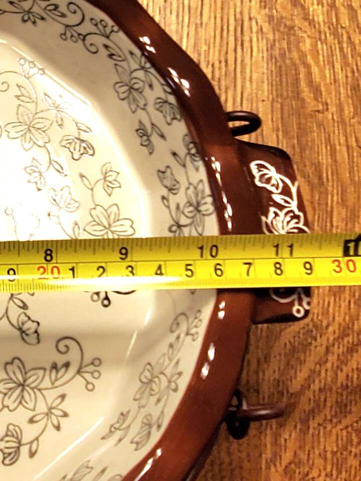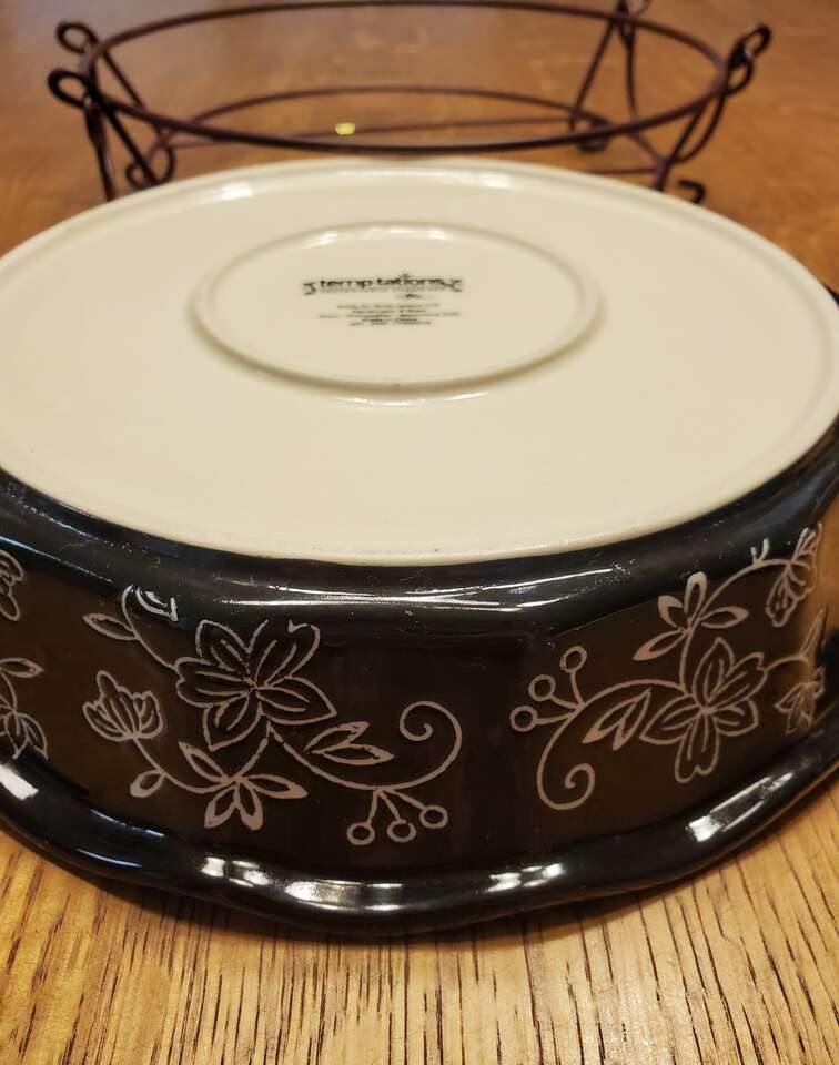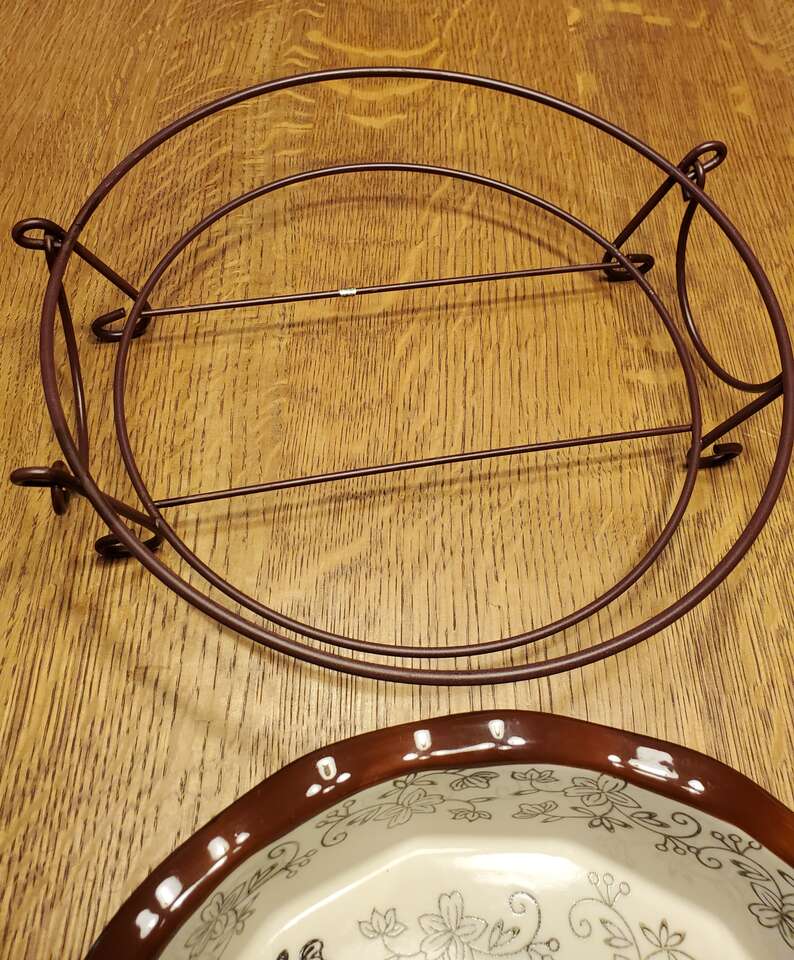 TempTations Presentable Ovenware Floral Lace Pattern Pie Dish with Rack Carrier. Cobalt Blue and Brown Ruffle Edge. Oven, Dishwasher & Microwave Safe. Cash Only, No Codes.