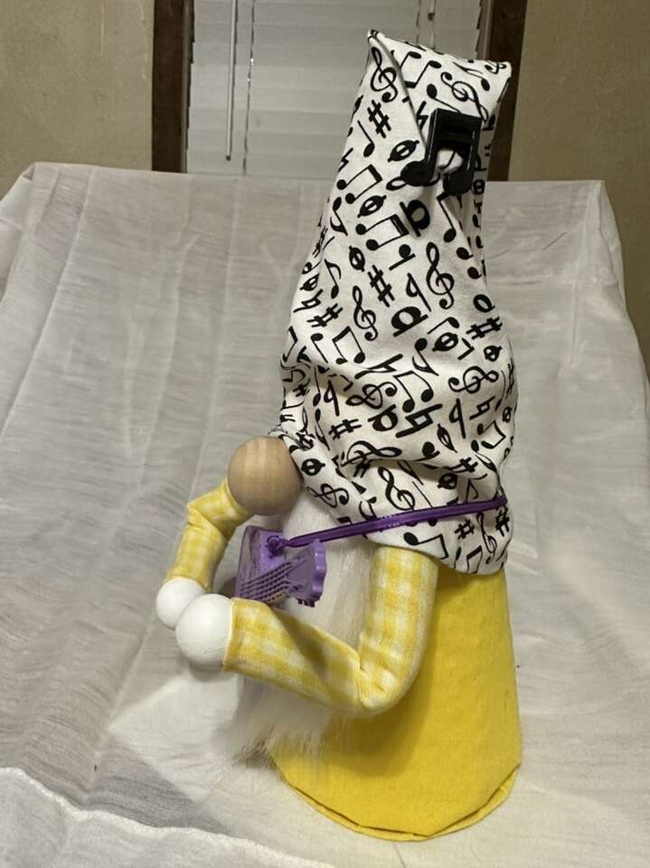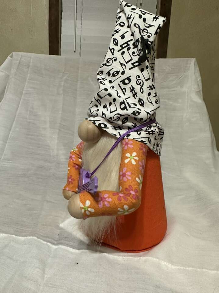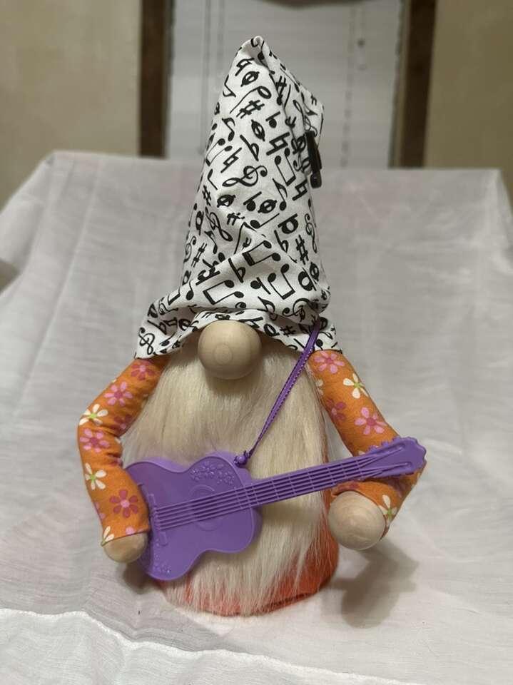 This gnome is playing the guitar. Hand crafted from fabric and craft items. Great gift for someone who loves their guitar. Only have 1 yellow or 1 orange left. You pick. Plus shipping if not picked up.