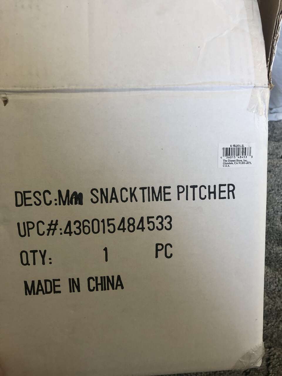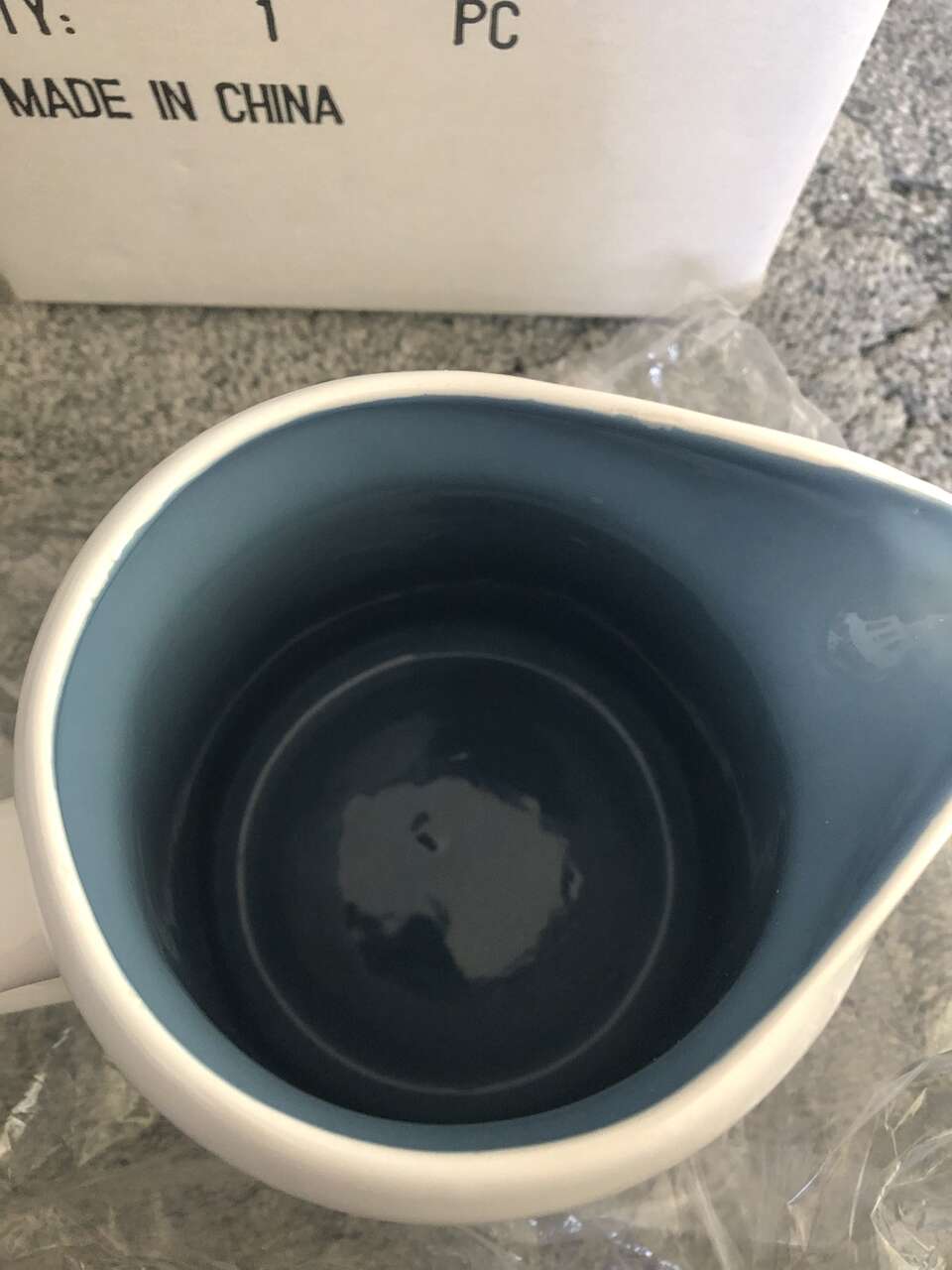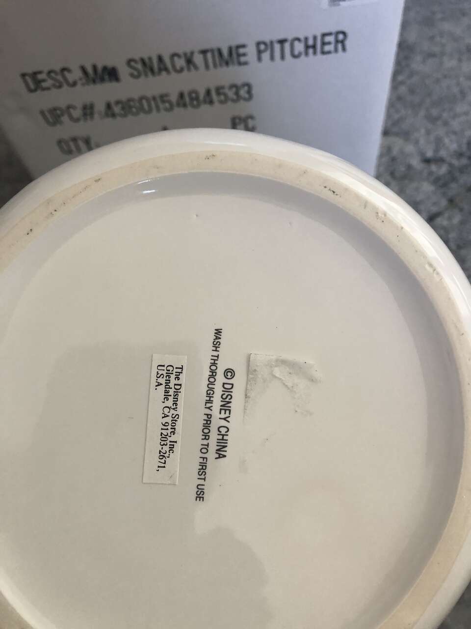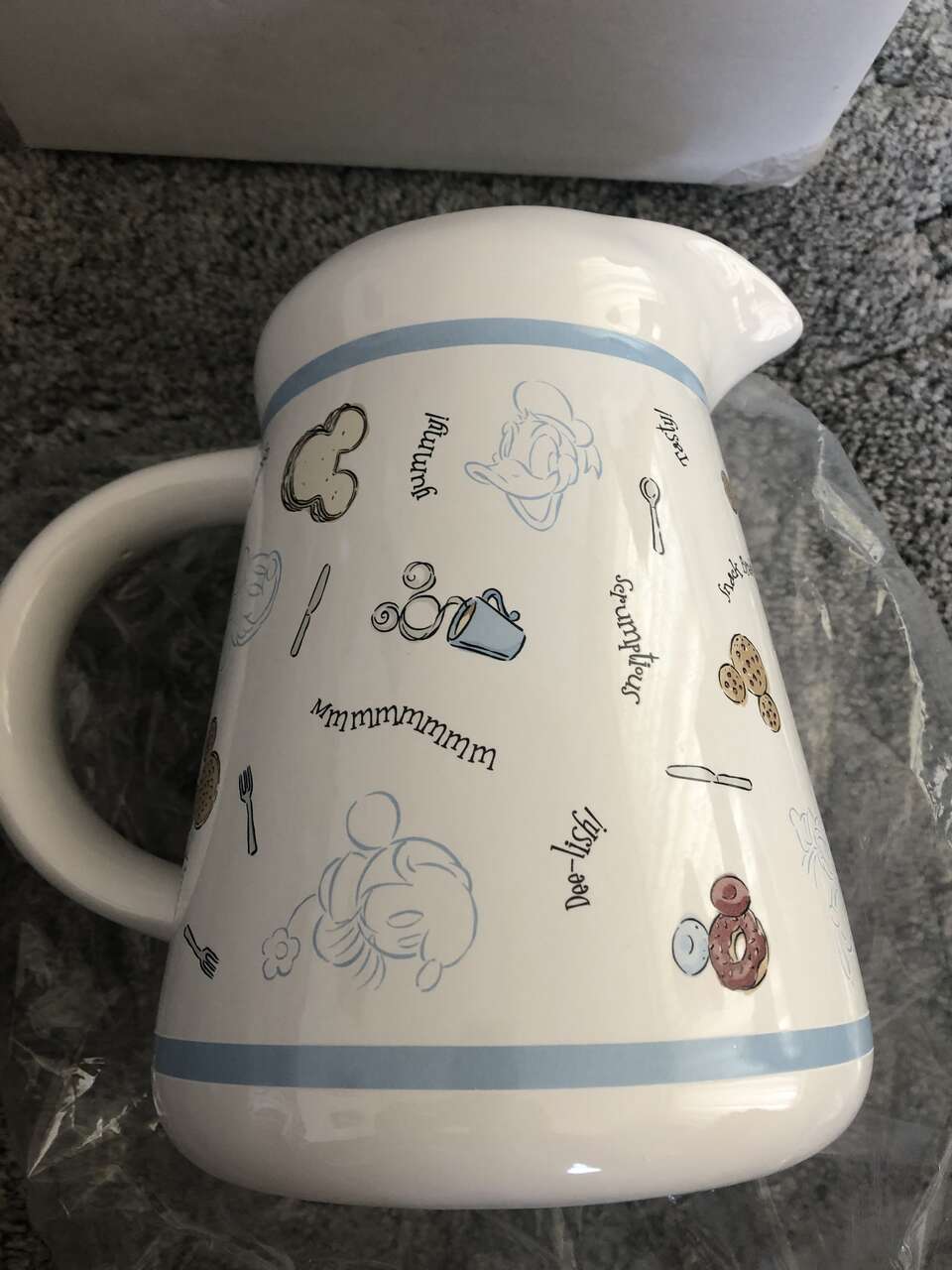 Fun, blue and white Mickey Mouse pitcher- has images of mickey, Minnie, Donald and Goofy Ali g with waffles, donuts and utensils. Inside color of pitcher is blue. Appx size is 7.5" tall