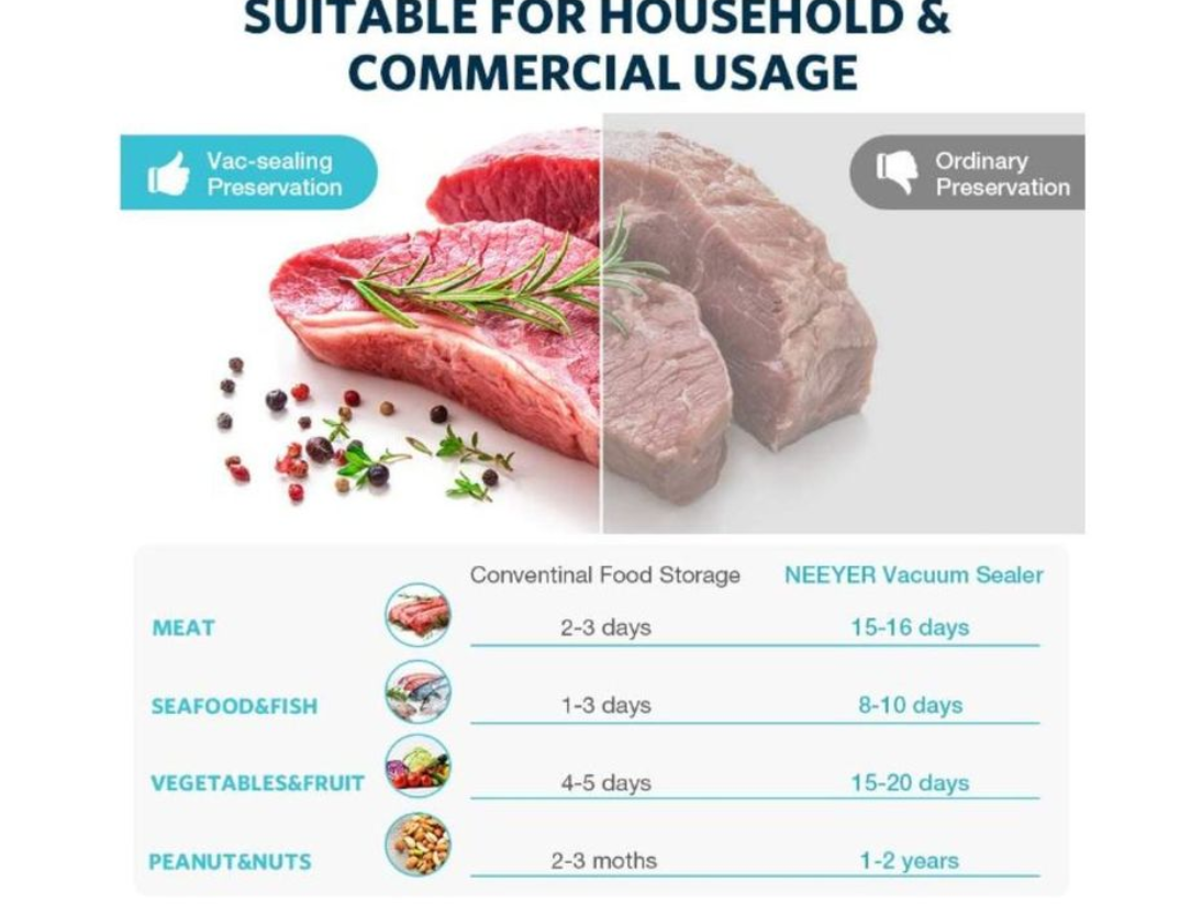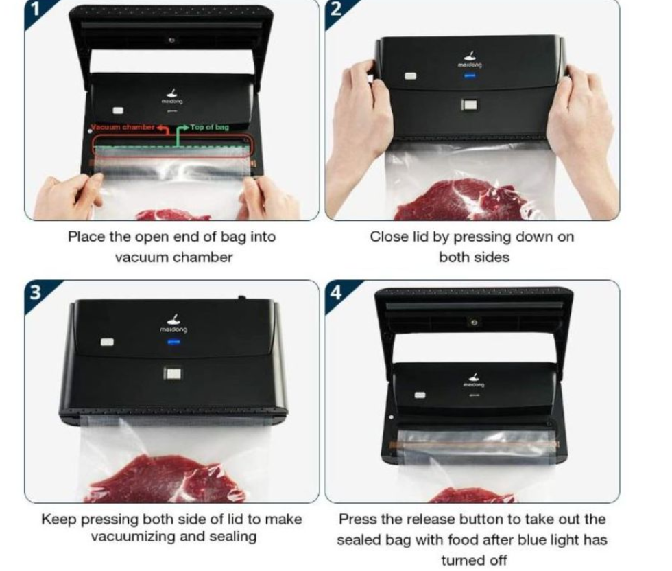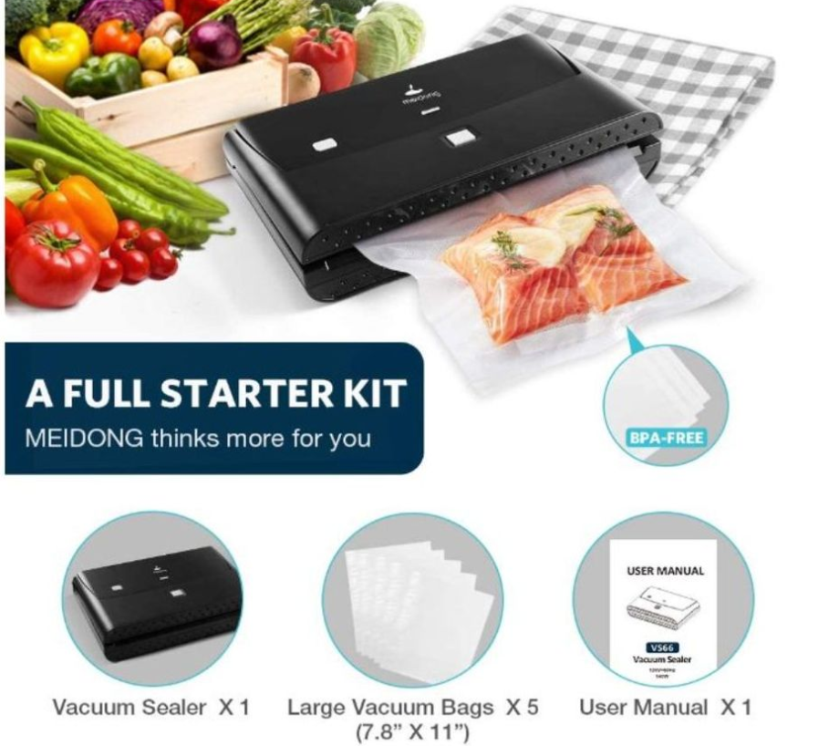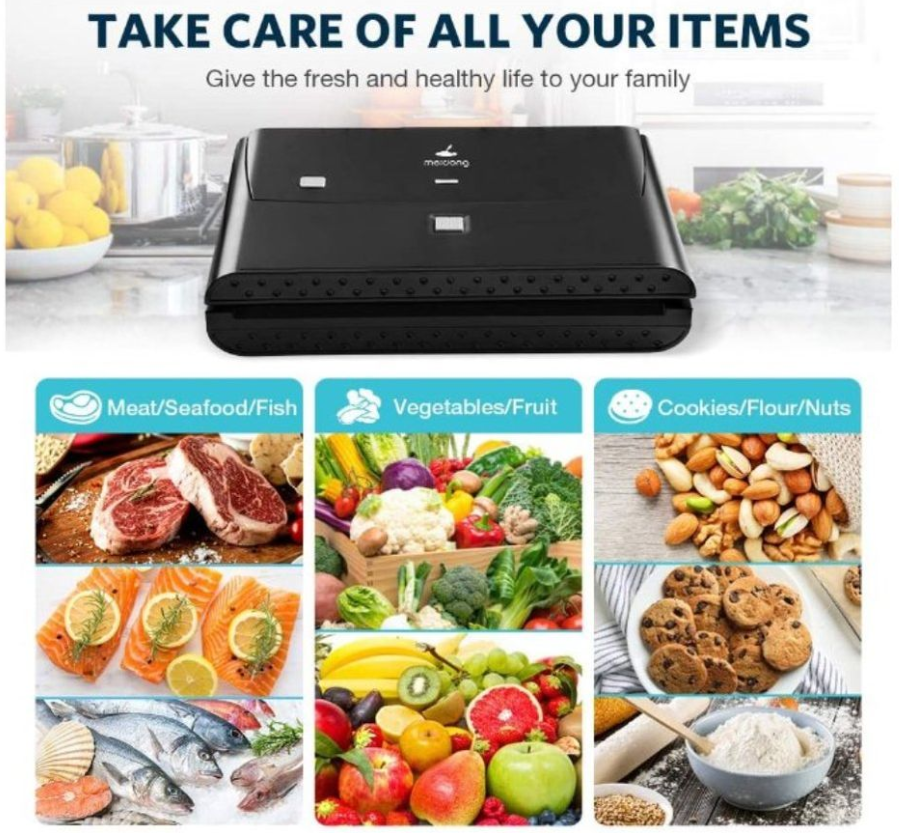 Keep Fresh Longer Meidong food vacuum sealer locks air out to keep freshness in. The durable sealed bag that preserves the aroma, freshness, taste and shelf-life of cookies, fish, fruits, meat, vegetables or other food items for later consumption.
