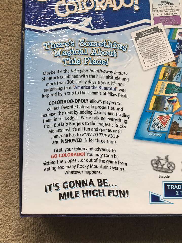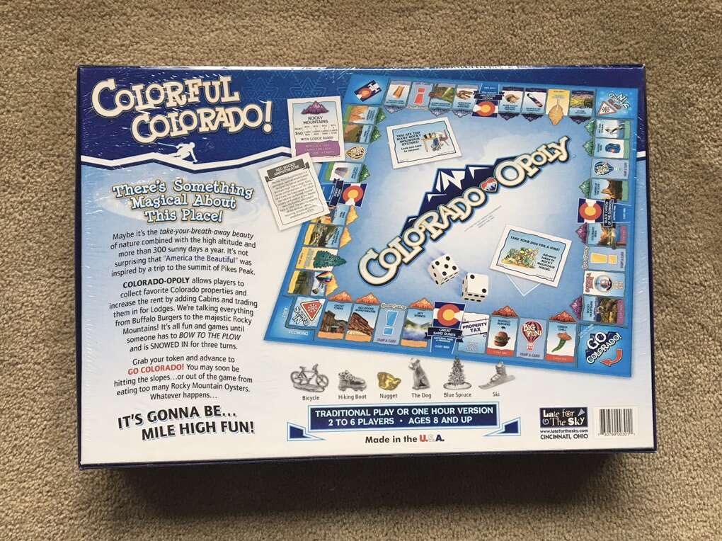 NEW (sealed in plastic) Colorado-opoly Board Game: A Game Celebrating Colorful Colorado! A Monopoly-style game by Late for the Sky. 2-6 players, ages 8+. New, unused condition. Text only. Cash or Venmo.