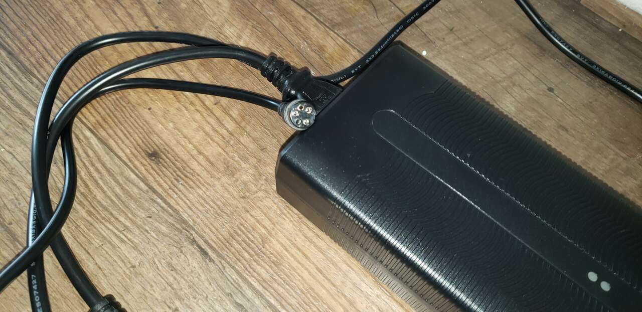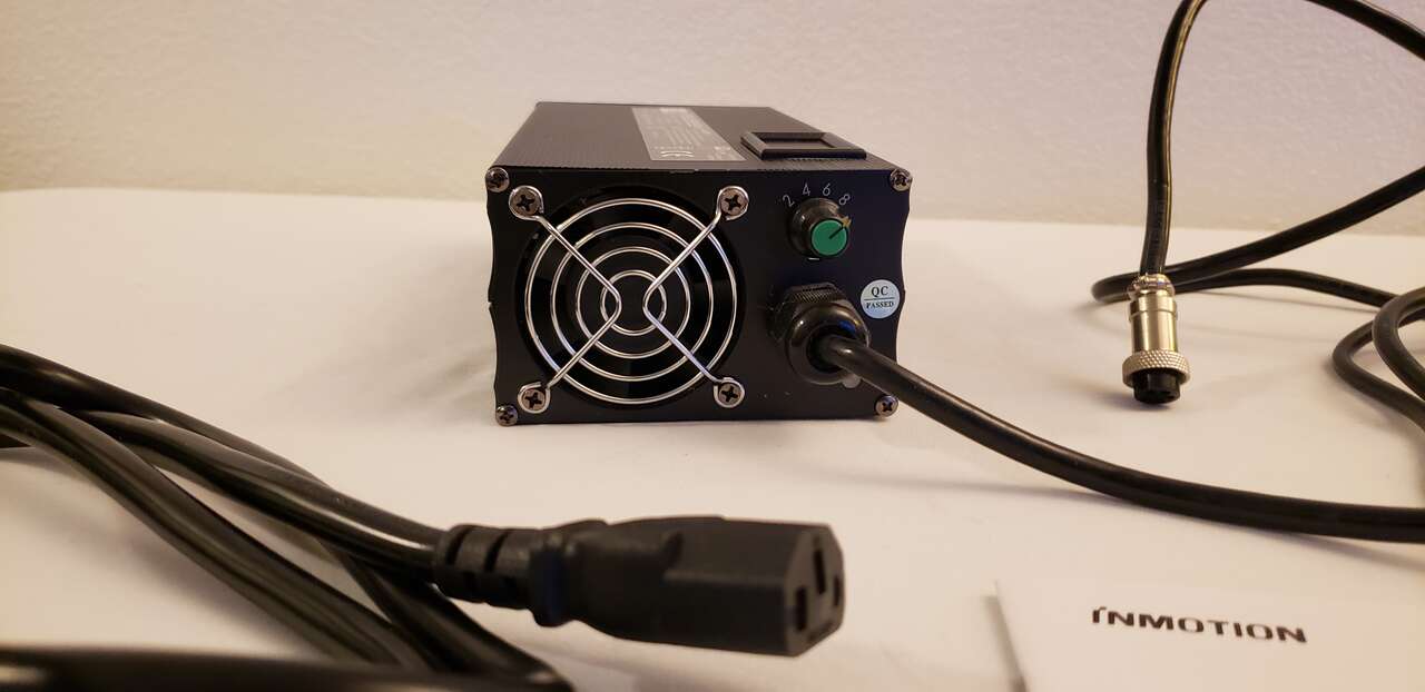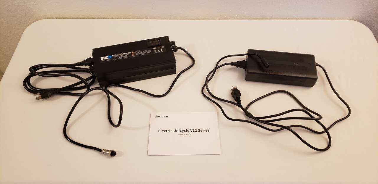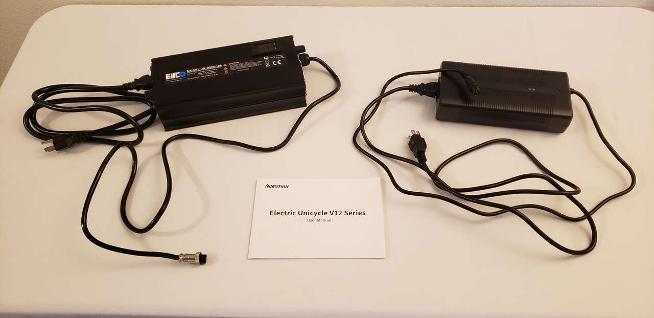 Both chargers are for Inmotion V12 electric unicycle (EUC) using Inmotion 3-pin connectors. I used the fast charger at home- which charges super fast- and because I used to ride the wheel to work a few miles away, I used the stock charger at there. Condition is like new and barely used because as I didn't have the V12 for very long. Take both for $75.