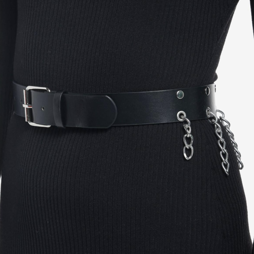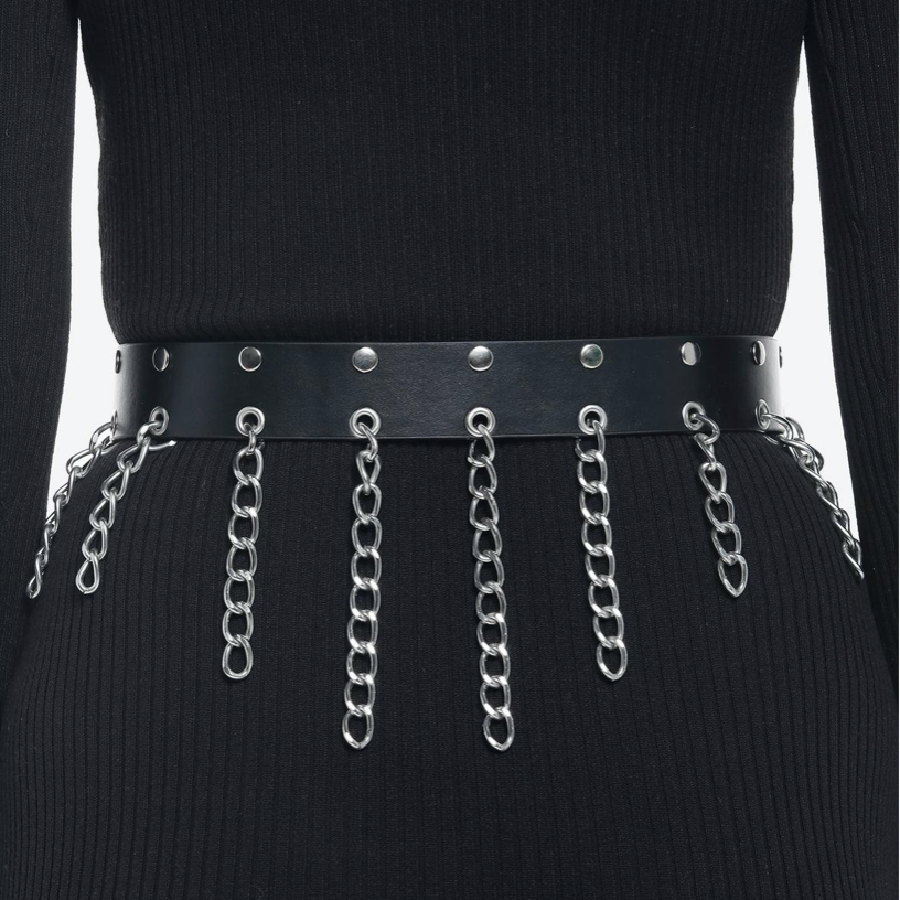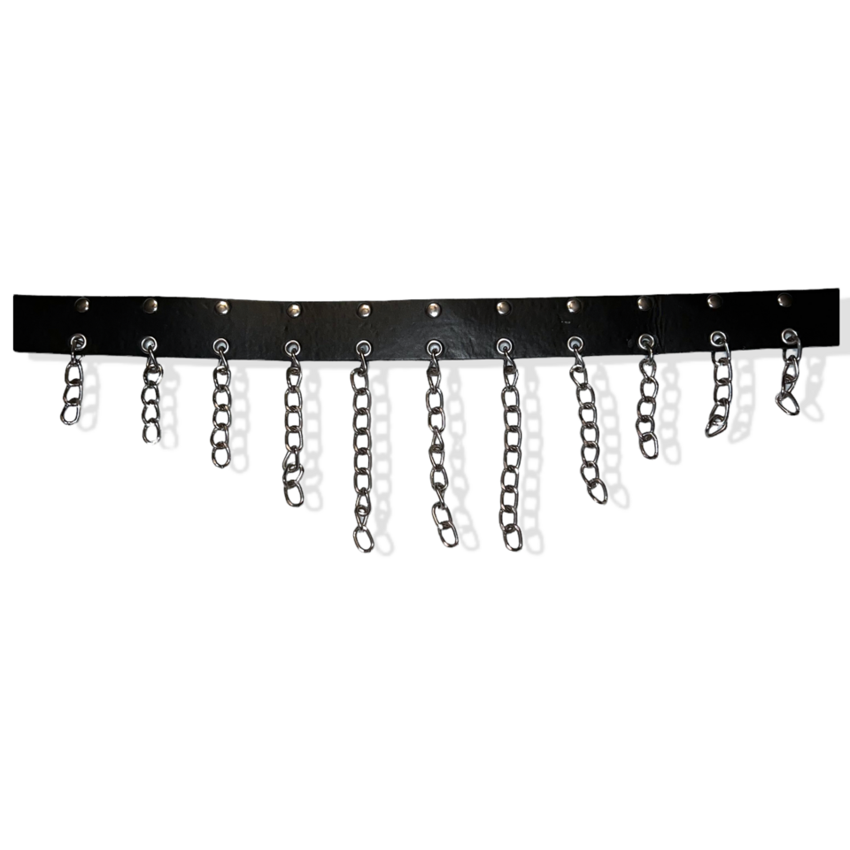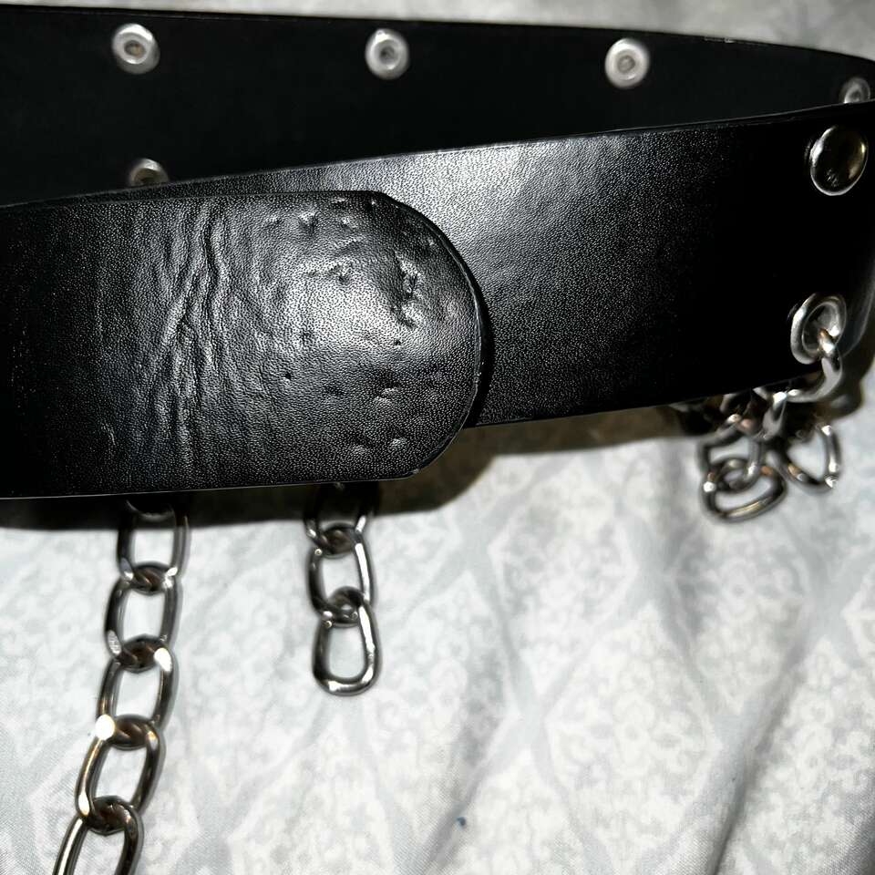 Good condition. It features a row of silver tone round studs and a row of silver tone grommets with dangling chains. 1.5" wide, faux leather. Bought at Hot Topic. Size Small is Sold Out!! Cash only.
